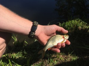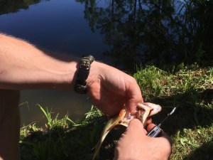 Und wir hatten Glück. Die eine oder andere Rotfeder ging uns an den Haken. Und damit wir später alles richtig machen und die Fische, die wir fangen und später essen wollen nicht leiden müssen, hat uns Michi noch gezeigt, wie man einen Fisch betäubt und den sachgemässen Kiemenschnitt durchführt (das kontrollieren wir Ranger am Pfäffikersee!).