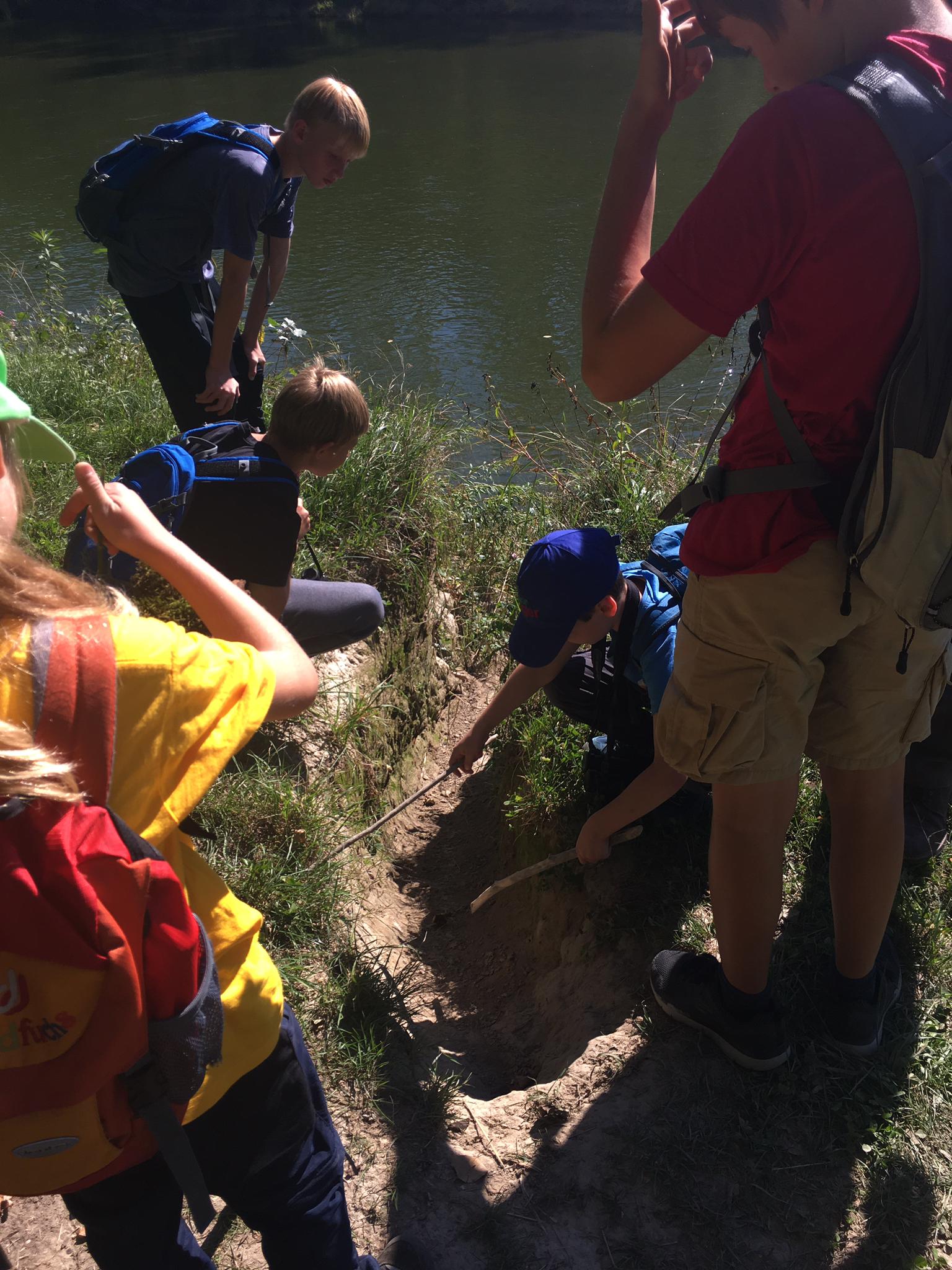 Weiter ging es entlang des Thurufers Richtung Wannemacher, einer künstlich angelegten Kiesbank um der Thur das Mäandrieren zu ermöglichen. Hier hat das Hochwasser gegen Ende August wahrlich Spuren hinterlassen. Die Junior Ranger lernten hier den Unterschied zwischen Prall- und Gleithang kennen, und welchen Charakter ein Fluss aufgrund seines Sediments mit sich bringt.