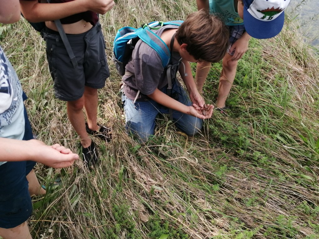 Durch das noch plattgedrückte Grass lassen sich im Moment auch viele andere Auenbewohner entlang des Ufers finden. So zum Beispiel auch der Grasfrosch (Rana temporaria). Ein regelmässiger Gast in unseren Feuchtbiotopen. Fun fact: Des Nachts ist der Grasfrosch auf der Jagd und am Tag versteckt er sich für gewöhnlich in der Vegetation. Ausser scharfe Junior Ranger Augen machen in ausfindig, dann muss er sich begutachten lassen.