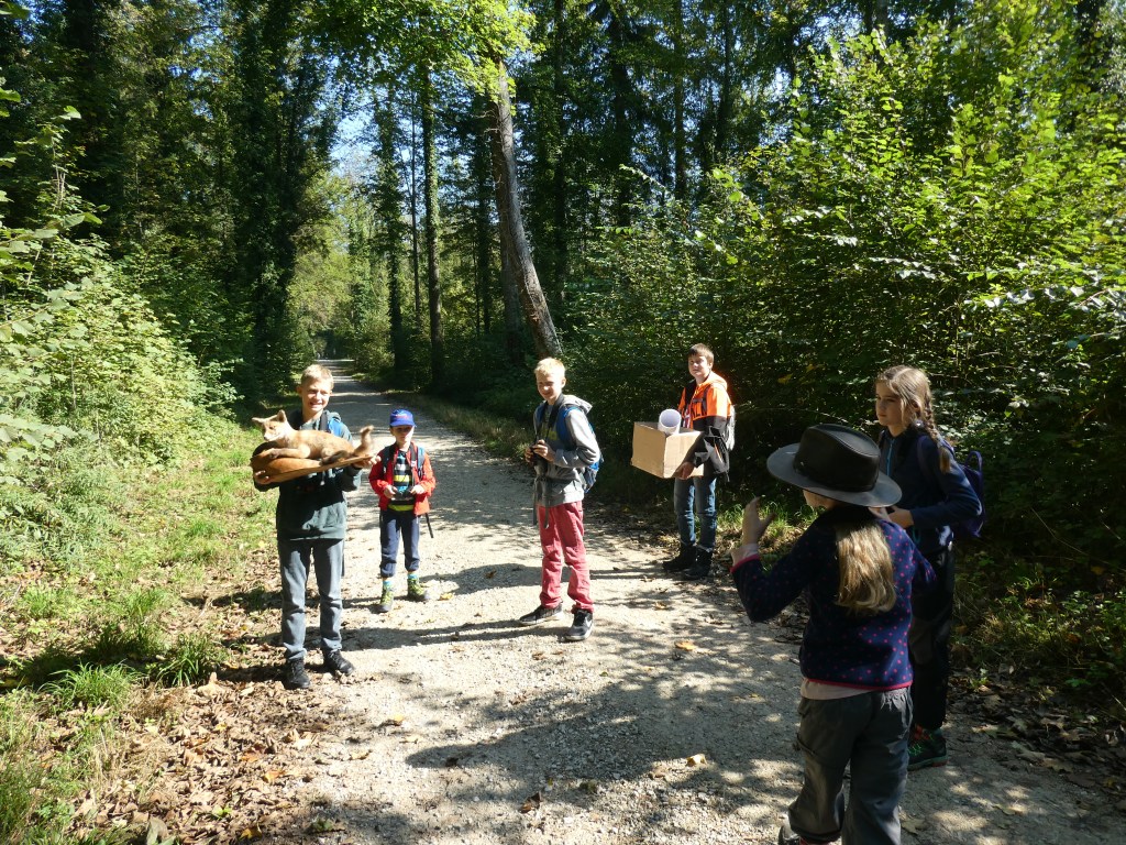 Als die Truppe zusammengefunden hat, sahen einige Kinder das erste Mal einen Fuchs aus dieser Nähe, wenn auch nur ausgestopft: Ein Präparat und kurze Leihgabe an den Rangerdienst vom Thurauenzentrum (Danke dafür). Bereits am Parkplatz wurde ich mit Fragen bombardiert: Ist das ein Fuchs oder ein Mader? Hast du ihn geschossen? Hast du ihn mit einem Messer gejagt? Sind die Augen echt? Warum ist das Fell so plüschig? Darf man hier überhaupt jagen und warum? Etc. etc.