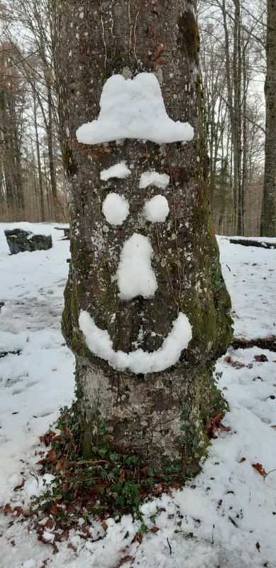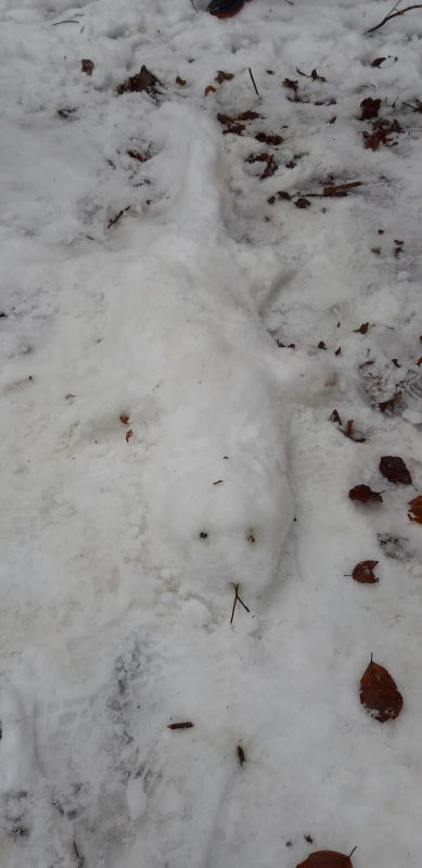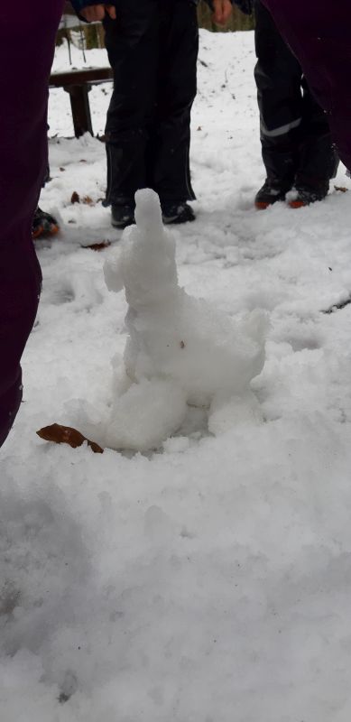 Nachdem wir den rutschigen Matschschnee Hang hinaufgeklettert sind, wurde das erlernte gleich umgesetzt. Die Junior Ranger haben aus Schnee Hirsch, Bär und Feuersalamander geformt und erklärt, welche Strategie ihre Tiere im Winter haben. Welche Strategie wohl der Ranger auf dem Baum hat?