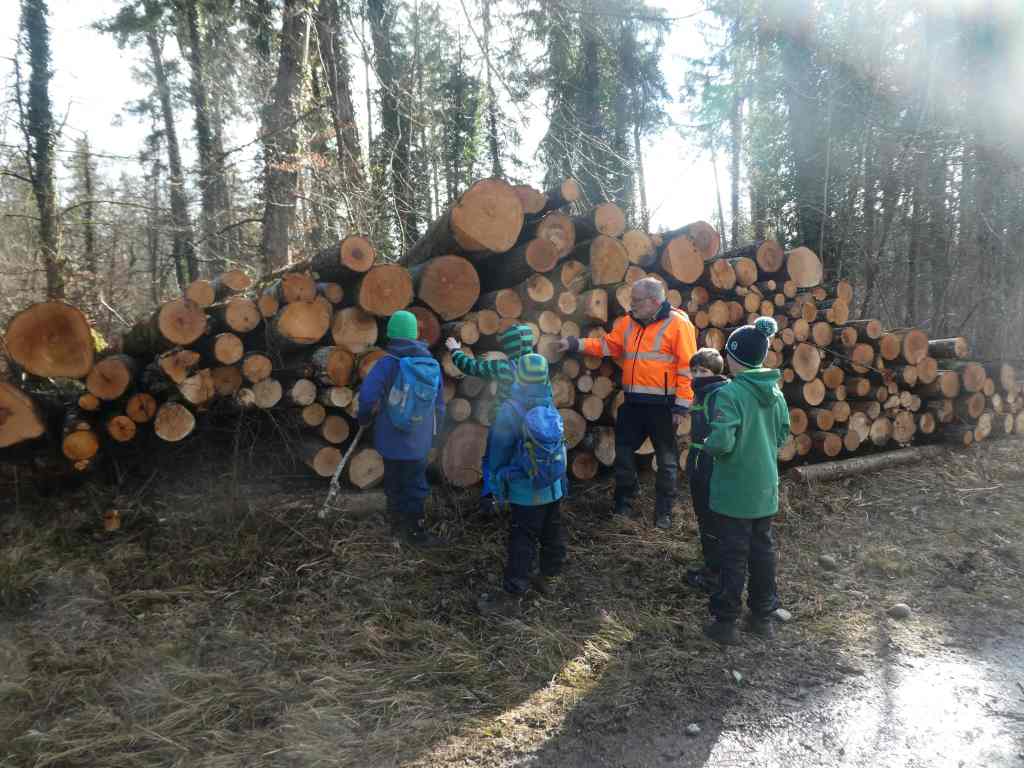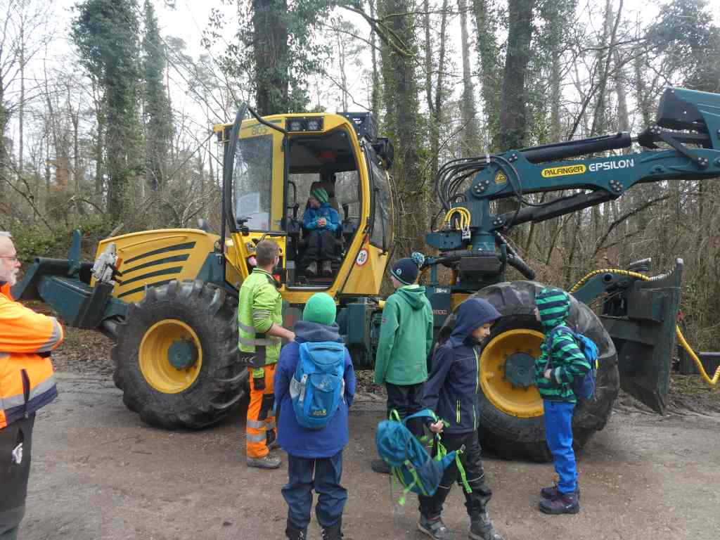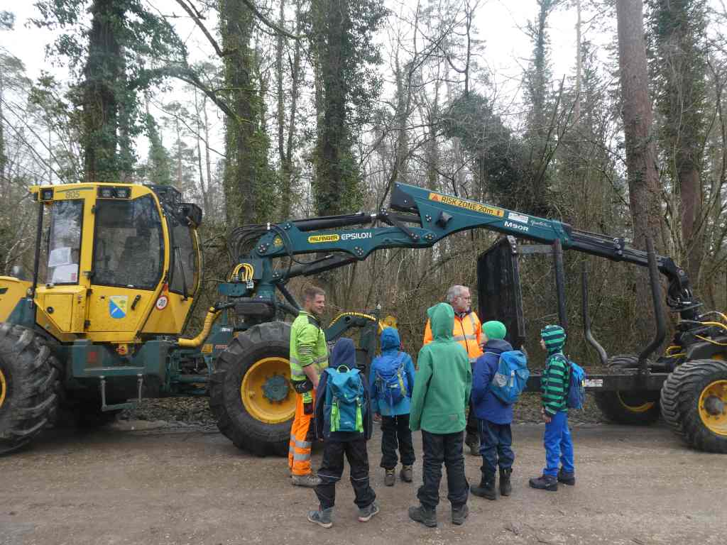 Unterstützt wurden wir bei diesem Modul von Beat Gisler, dem Revierförster aus Flaach und Zuständigen in den Thurauen. Es ging nach einer Begrüssung erst einmal darum, Fragen zu beantworten, wie z.B. was denn der Forst überhaupt in einem Naturschutzgebiet macht, da ja eigentlich alles unter Schutz steht. Weiter ging es auch darum, auch die Unterschiede zwischen einen Forstwart, einem Förster und einem Forstingenieur klarzustellen. Es gelang sehr gut, Zusammenhänge zwischen den vorhergehenden Modulen, wie der Jagd, herzustellen, um aufzuzeigen, wie sehr das ganze „Geschäft“ um den Naturschutz vernetzt ist. Doch das alles verblasste praktisch sofort, als die erste Maschine vorfuhr. Der Gesichtsausdruck der Kinder änderte sich mit einem Schlag und sie waren wieder Feuer und Flamme für das Juniorrangern.