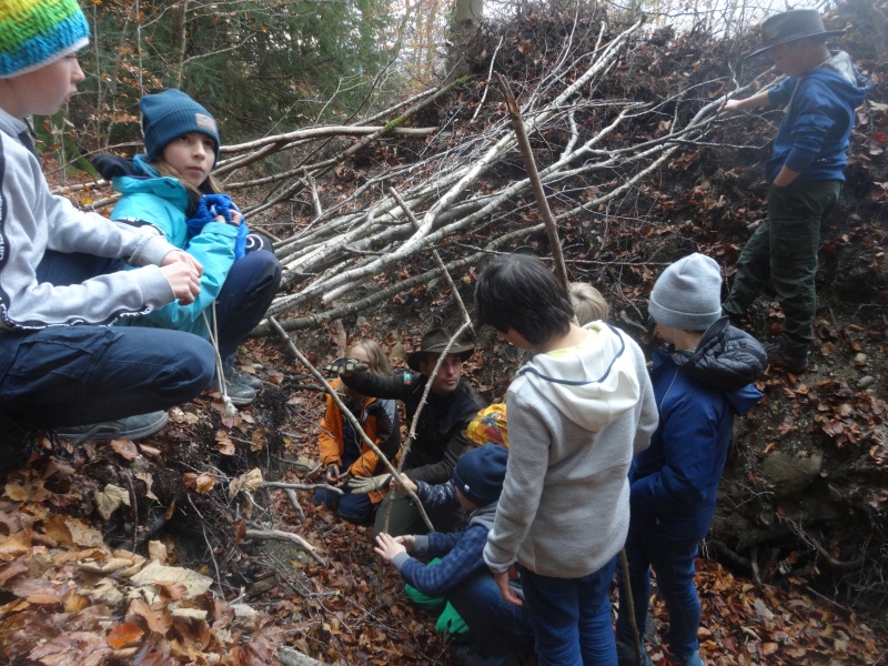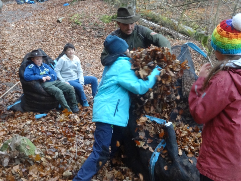 Das so gewonnene Laub haben wir in grosse Netzsäcke geladen, da wir Nachschub an trockenem Laub für den Barfussparcours brauchen. Bekanntlich geht es mit vielen Händen schneller als alleine.