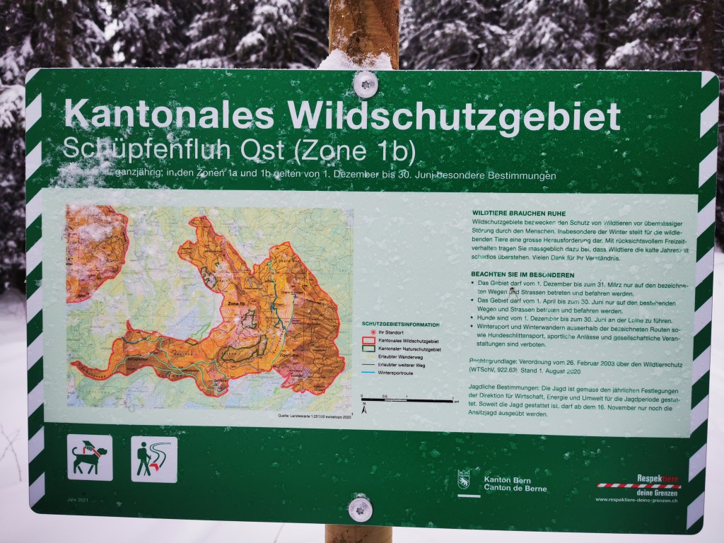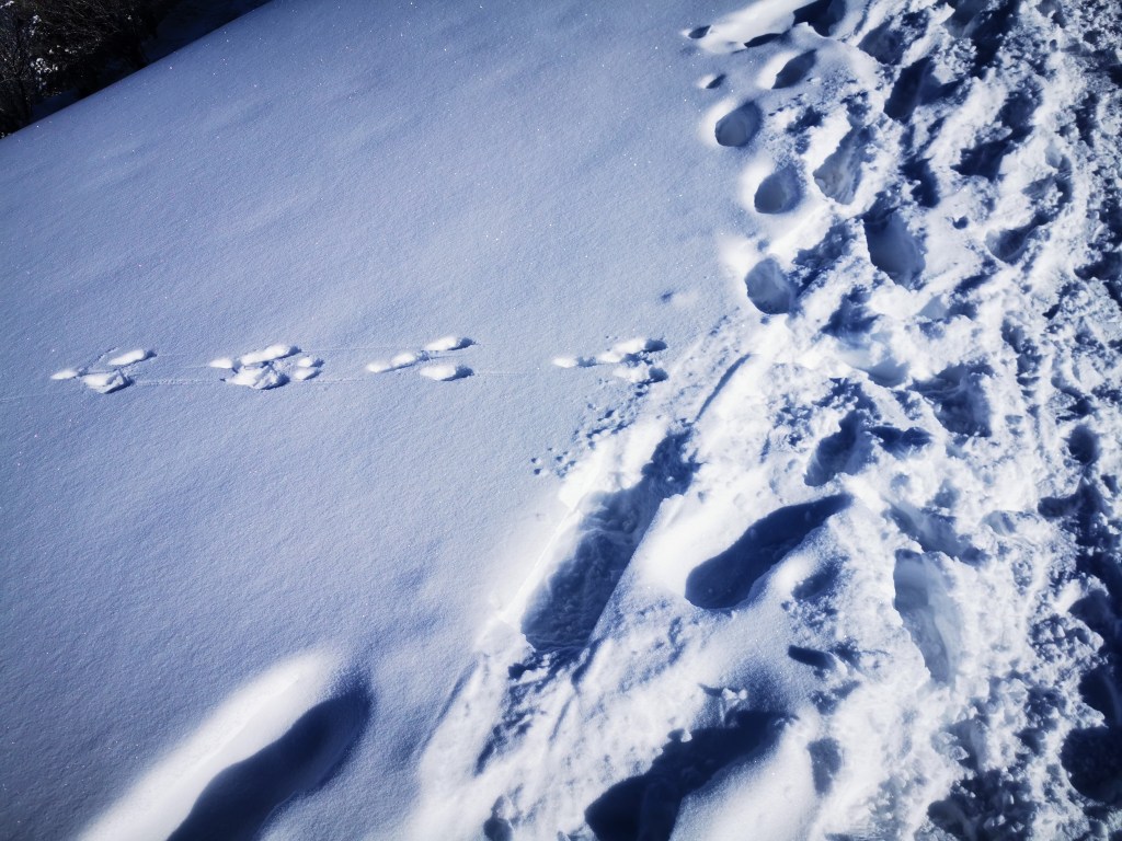 Im Winter wenn es Schnee hat, sind die Spuren der Tiere besonders gut zu lesen. Aber nicht nur die Spuren der Tiere! So hat ein Fuchs auf diesem Bild die Spur eines Snowboarders sich zu Nutzen gemacht und ist ihr gefolgt. Denn Energie zu sparen ist für die Tiere im Winter besonders Wichtig.