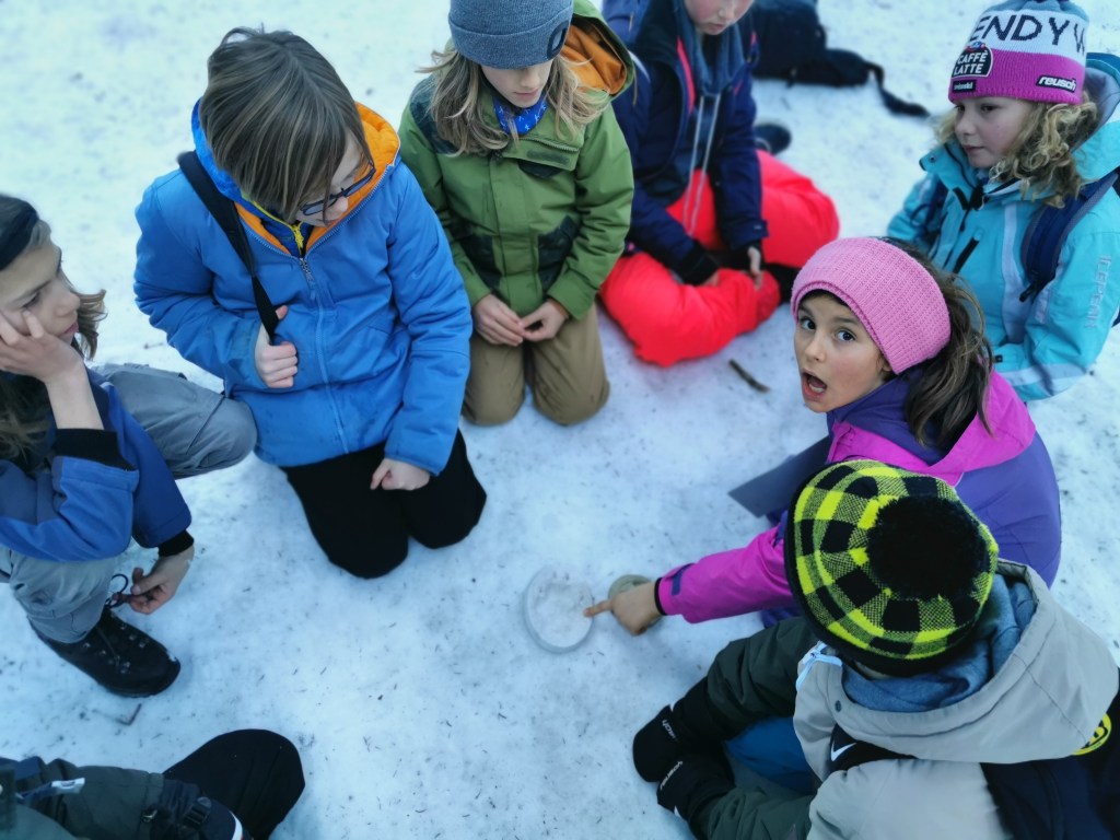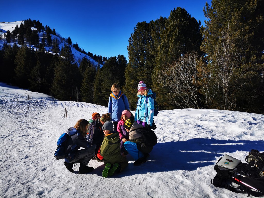 In zwei Gruppen aufgeteilt, überlegen sich die Junior-Ranger was es für Tiere in dieser Jahreszeit im Gantrischgebiet hat. Auch was die Freizeitnutzungen der Menschen im Gebiet sind. Die hinterlassen ja auch entsprechend unterschiedliche Spuren. Die beiden Gruppen haben sehr viel aufgezählt.