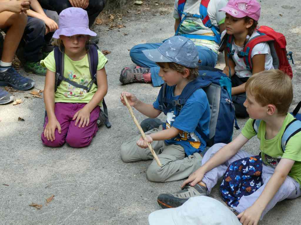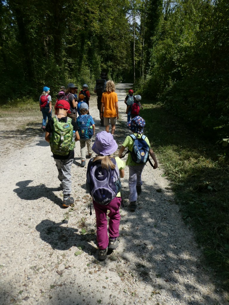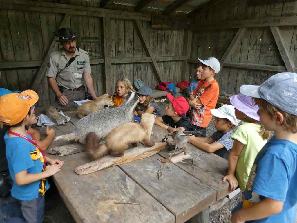 Nach der Begrüssung gingen wir los. Rangerin Sarah und Ranger Dario erklärten den Kids was ein „Waldpolizist“ so macht und was dieser im Alltag für Materialien braucht.