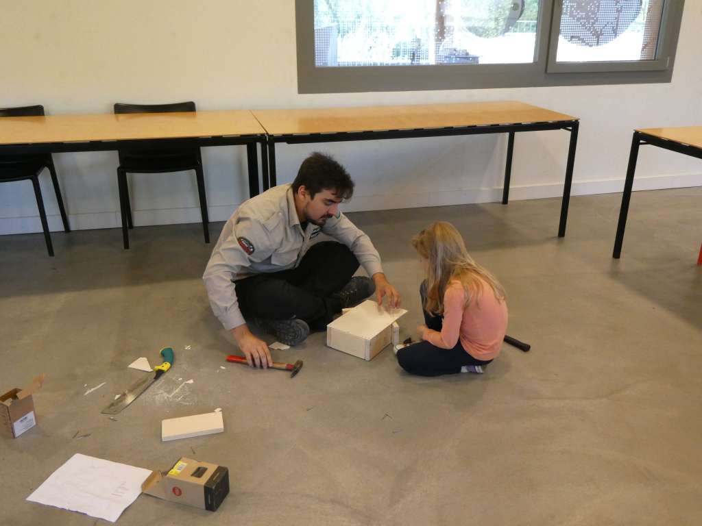 Andere brauchten etwas mehr Starthilfe. Man erklärte es nochmals Schritt für Schritt, drehte sich um, um Anderen zu helfen. Plötzlich hiess es: „Ich bin fertig!“, man drehte sich erneut um. Ergebnis: Picasso. Das Dach ist verkehrt herum und die Wand verdreht. Also nochmal von vorne…