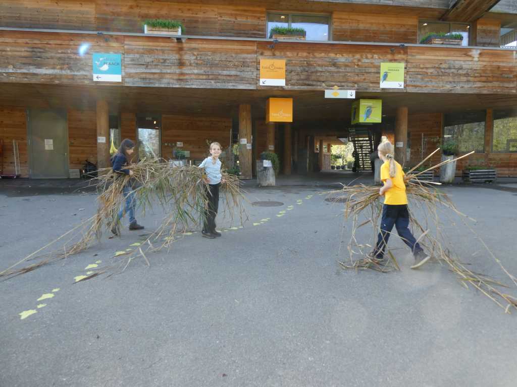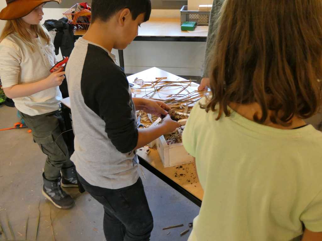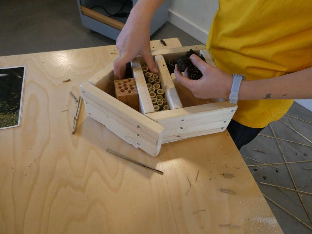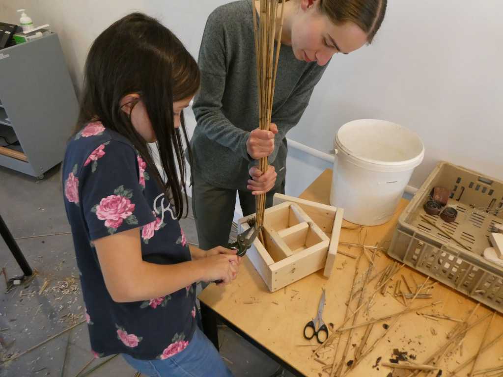 Anfangs wurde sich noch Material zum Füllen der Hotels gesucht. Dafür nahmen wir Schilf, welches dann später zugeschnitten wurde. Die Hotels wurden bereits als Bausatz vom Leiter vorgeschnitten, sodass man sich ganz dem Zusammenbauen widmen konnte. Der Aufbau wurde anhand eines Prototyps und nochmals anhand einer Zeichnung erklärt, aber es herrschte anfängliche Unsicherheit. Einige Junioren griffen Gleich zu und machten sich an die Arbeit.