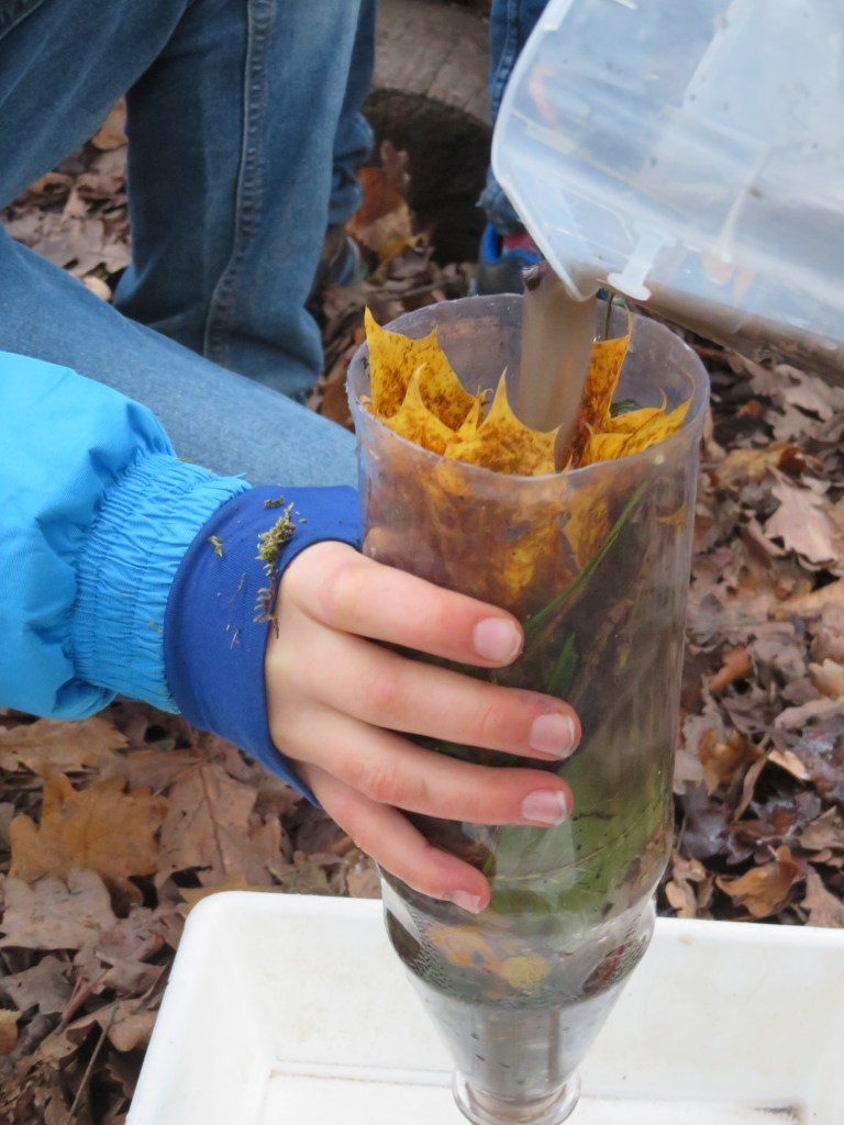 Im Anschluss an die Führung machten wir uns wieder auf den Weg nach draussen, um nun selber tätig zu werden. Aufgabe war es einen möglichst guten und effektiven Wasserfilter mit Materialien aus dem Wald und Umgebung zu Basteln und auf die Probe zu stellen.