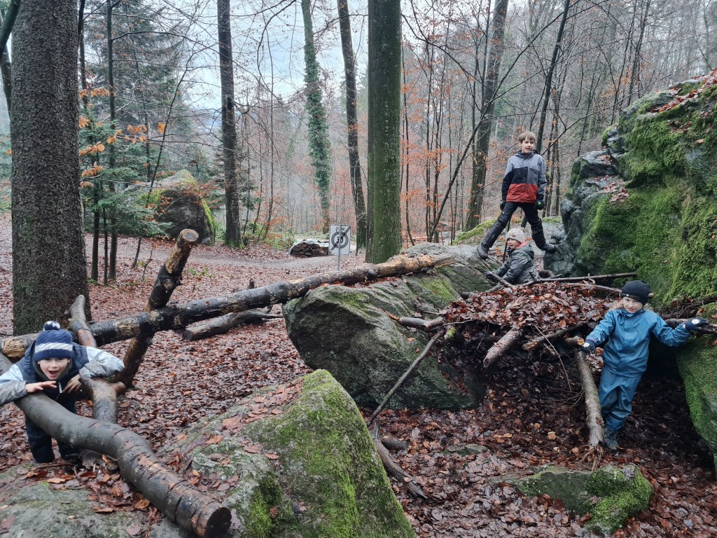 Am grossen Blitzstein angekommen, haben wir diesen mit selbstgesammelten Steinchen aus dem Bach verglichen. Dabei fiel uns sehr schnell die runde Form der „Bachsteine“ im Vergleich zum grossen eckigen Bruder auf. Die kleinen Steine wurden vom Wasser hierher geschleppt. Das haben wir an der abgerundeten Form erkannt. Aber der Grosse? Viel zu gross und zu eckig!