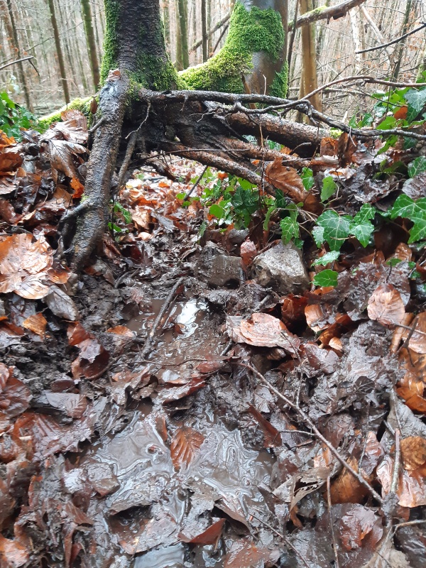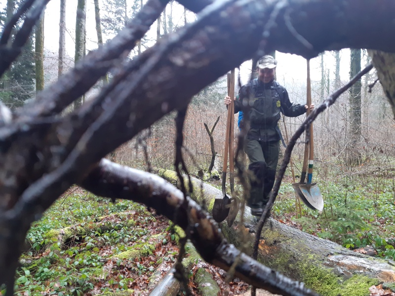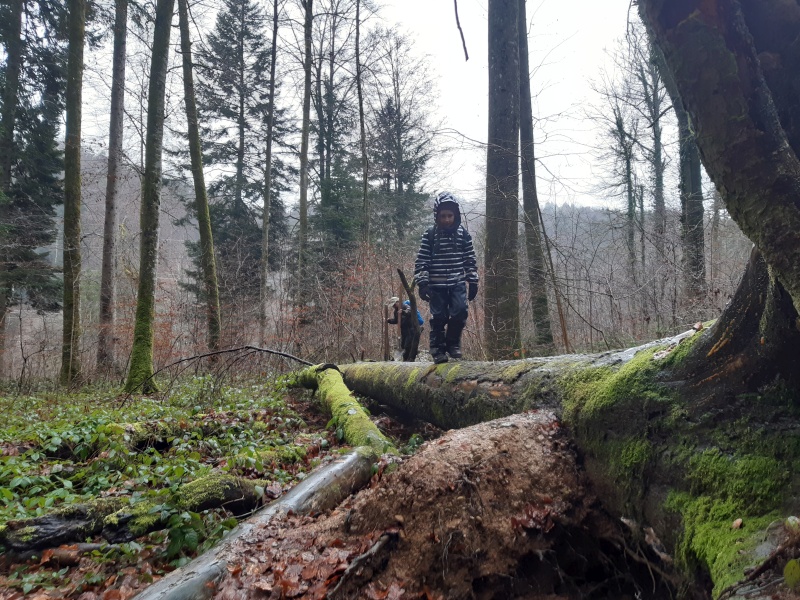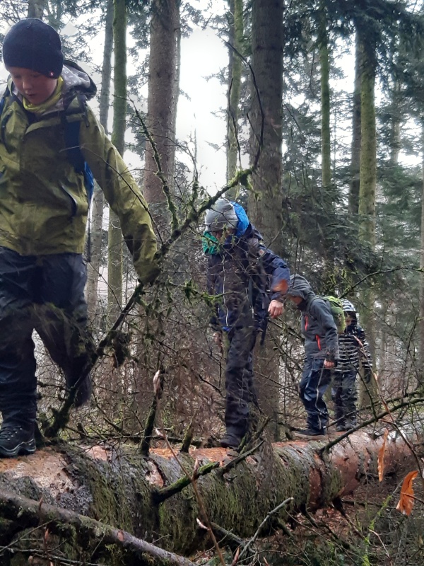 Letzte Woche ging es bei strömendem Regen ab in den Wald. Am Anfang balancierten wir über einen liegenden Baumstamm der dieses Mal sehr glitschig war. Nach dem alle heil auf der anderen Baumseite an kamen, bemerkten wir den Zerfall des Wurzeltellers.