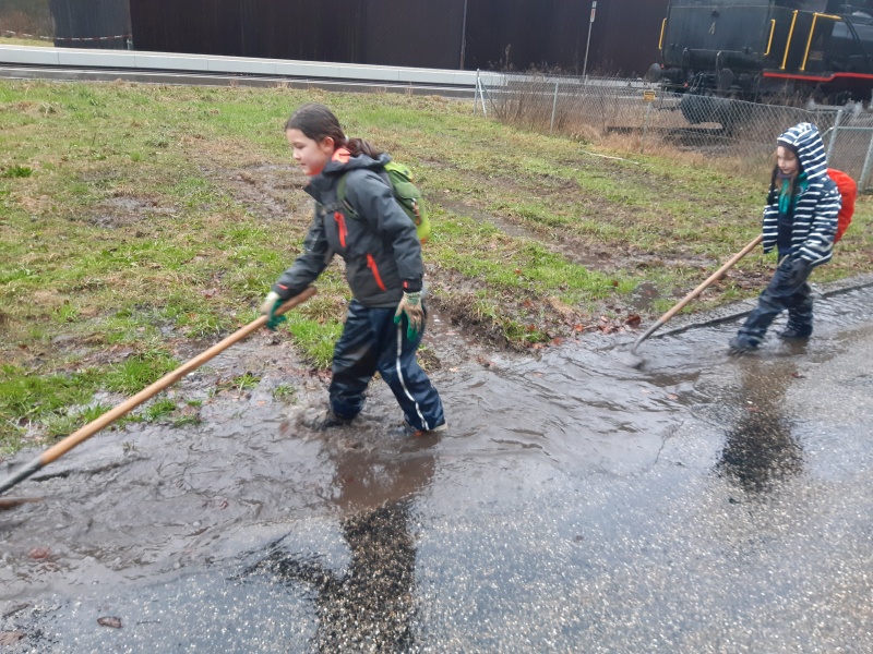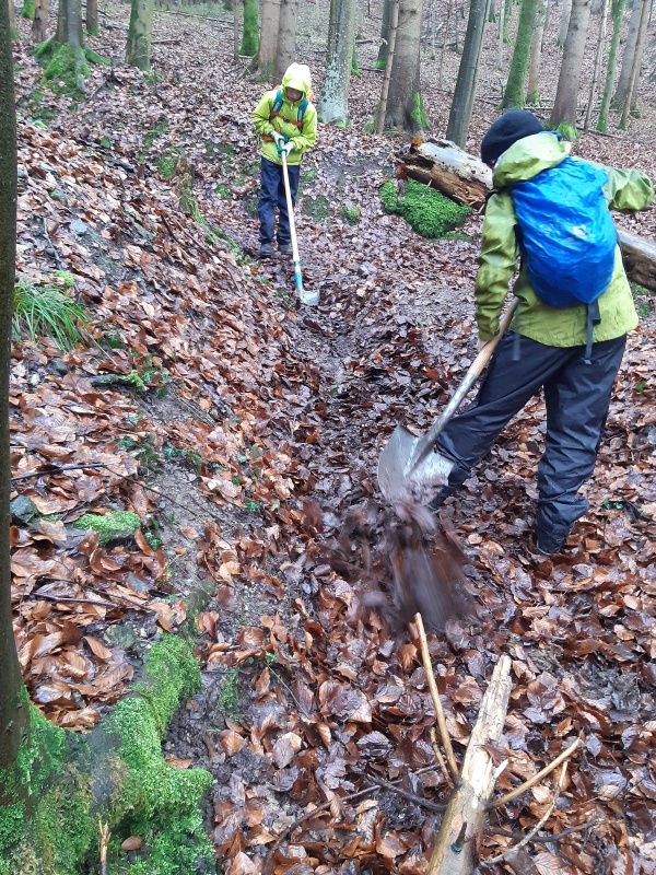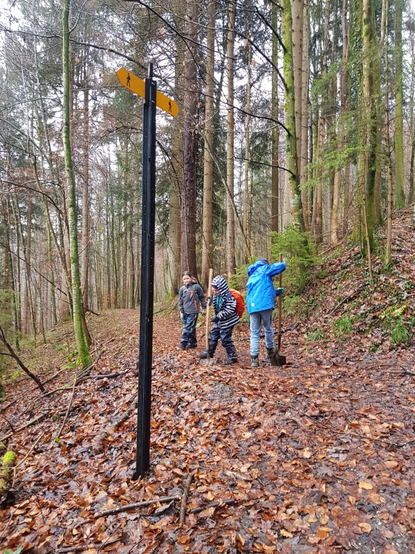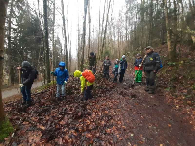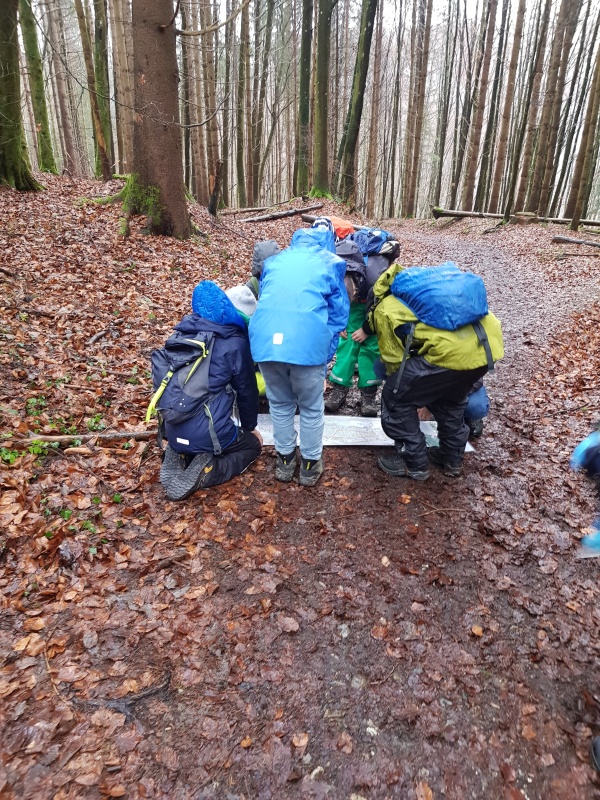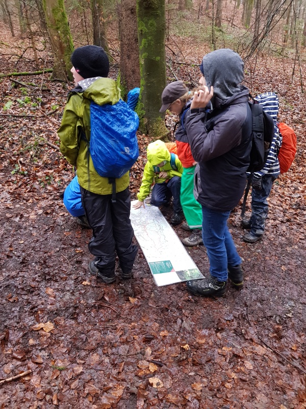 Weiter gings Quer durch den Wald. Wo sind wir gelandet? Die JR mussten zusammen die Gebietskarte ausrichten und zeigen wo wir waren. Nach dem die JR sogar die Regeln auf dem Wegabschnitt wussten, haben wir uns mal ein Querschnitt von Wegen und Strassen angeschaut. Beim runterlaufen haben wir zusammen mit den Schaufeln die Wasserrinnen raus geputzt und sahen gleich die verschiedenen Schichten des Weges.