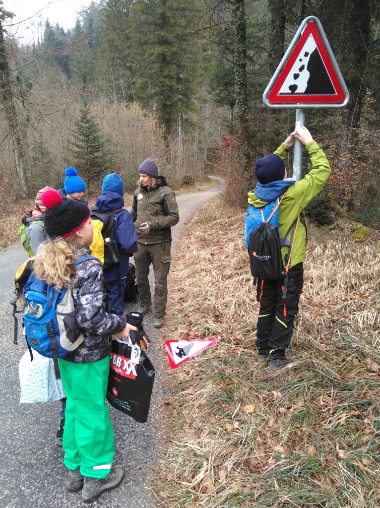 Zunächst montierten wir ein Schild, um Autofahrer auf die bevorstehende Amphibienwanderung aufmerksam zu machen und betrachteten dann Lebensräume vor dem Hintergrund, wo sich Frosch & Co. wohlfühlen könnte.