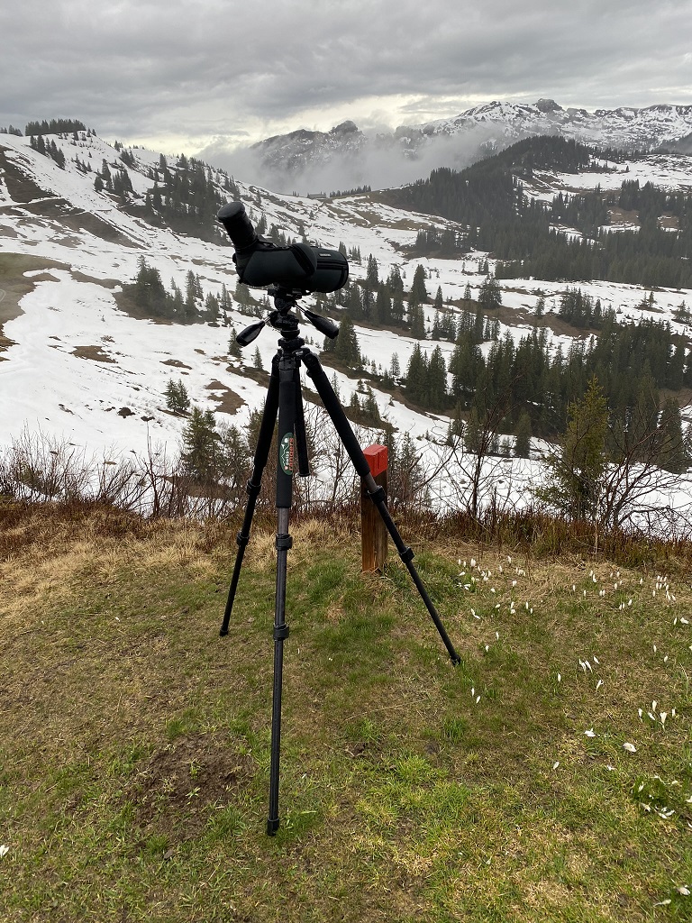 Ein weiteres Mal Ende April starteten wir frühmorgens auf unsere Birkhahnzählung. Es regnete und windete aber der Nebel hielt sich zurück. Sprich:gute Bedingungen zum Beobachten. Leise begaben wir uns nach Tagesanbruch auf unseren Beobachtungsposten, schauten, dass wir die Wege nicht verliessen und hielten uns still. Wir mussten lange suchen, bis wir den ersten Hahn entdeckten. Insgesamt sahen wir 4 Birkhähne. Etwas später am Vormittag machten wir ein Feuer und waren froh, dass wir uns aufwärmen konnten.
