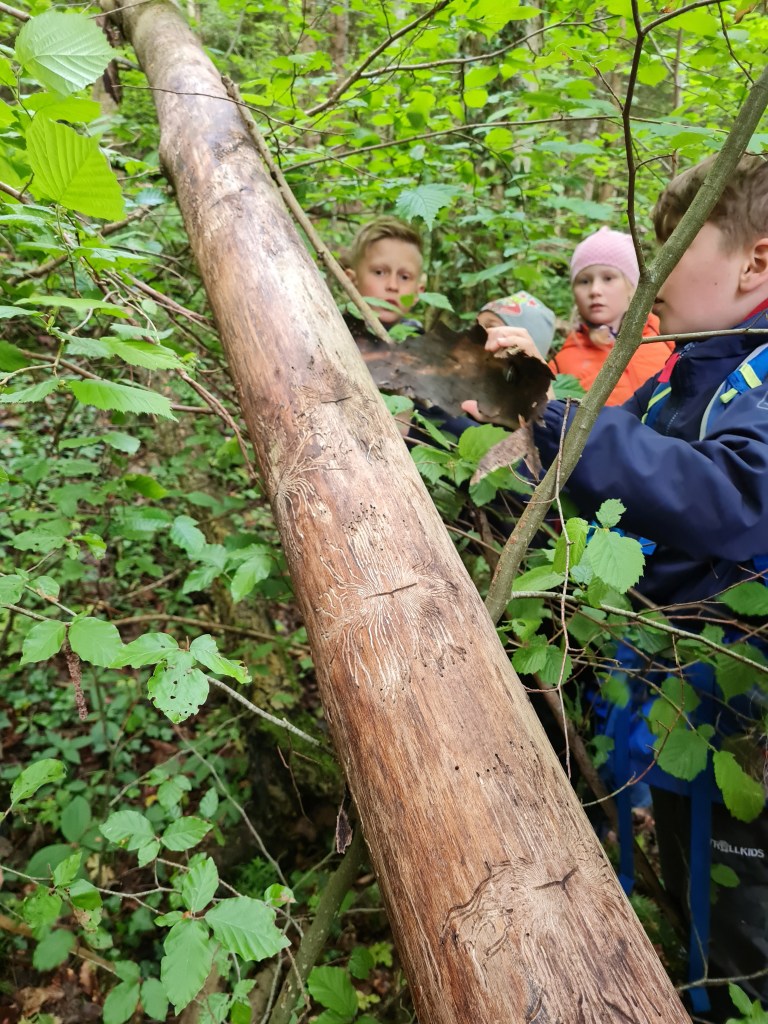 An einer umgestürzten Fichte konnten wir sogar Spuren des Borkenkäfers entdecken. Gut dass wir kein Holz verkaufen müssen, so konnten wir die Frasgänge als kleines Kunstwerk betrachten. Spontan haben wir dann darüber diskutiert warum Mischwälder stabiler als reine Monokulturen sind, dass auch der Borkenkäfer seine Daseinsberechtigung im richtigen Masse hat und wie die Fortpflanzung funktioniert.
