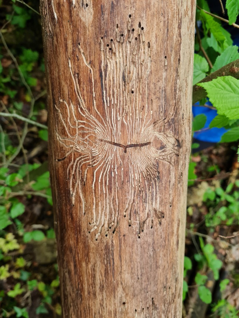 Rammelkammer, Muttergang und die Ausflugslöcher der Käfer ergeben ein sehr spannendes Bild und erzählen viel über das Leben als Borkenkäfer. In unserem Beispiel war es der Buchdrucker.