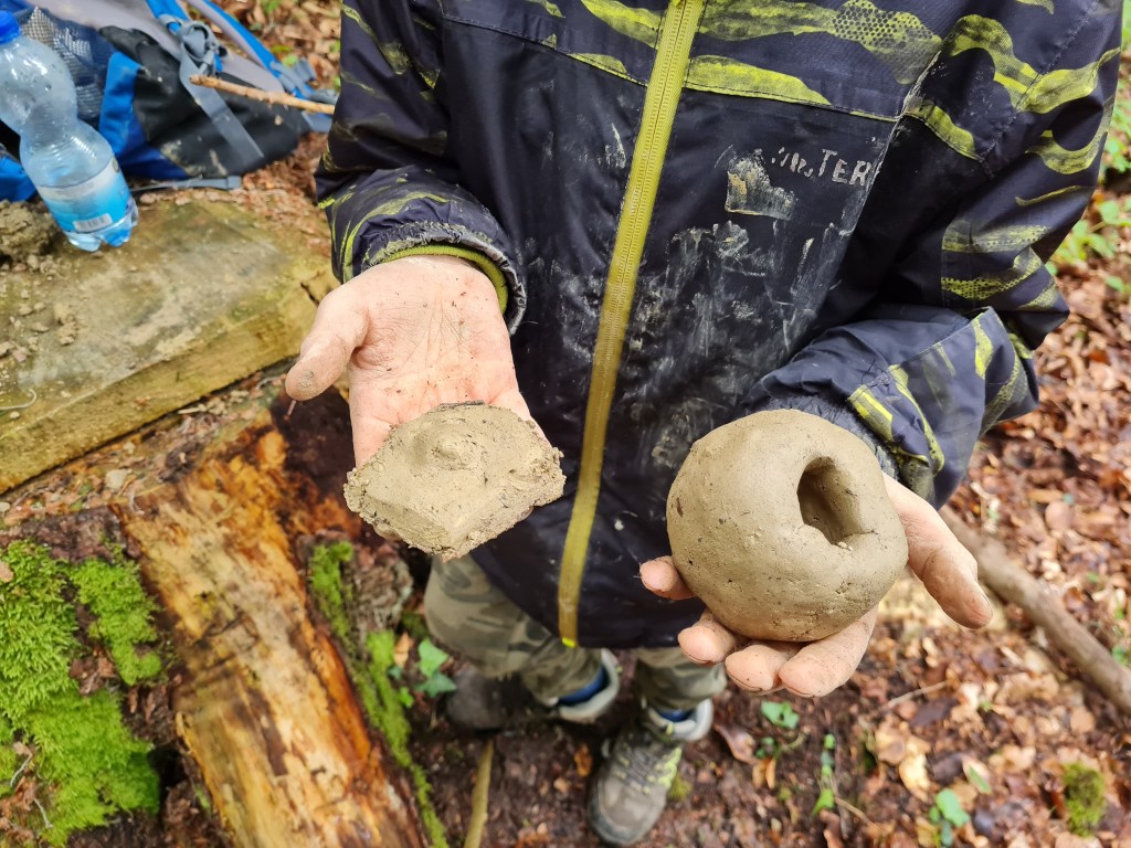 Auf der höchsten Ebene im Wald angekommen haben wir wie immer grilliert und den Bestand der mitgebrachten Cervelats auf ein gesundes Mass reduziert. Dort fiel uns der viele Lehm auf, deshalb haben wir uns noch im Töpfern versucht. Harry Potter wäre stolz! (engl.: to make pottery = töpfern) 😉