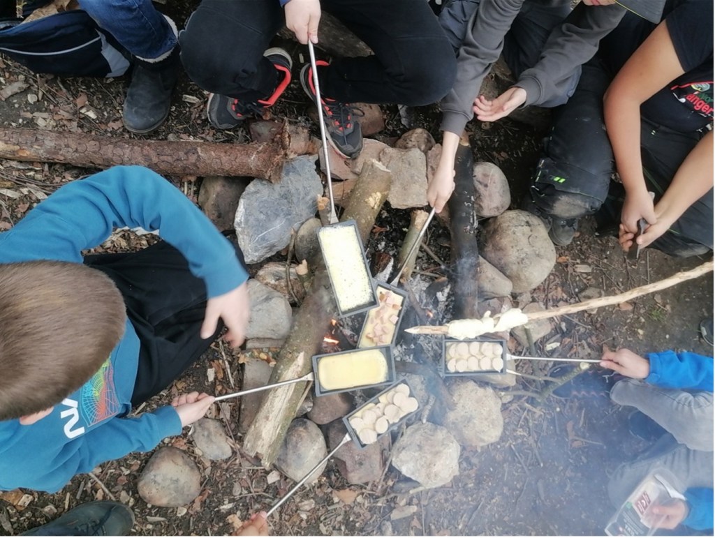 Es ist Zeit für eine Pause. Raclette mit Wursttopping ist das Lieblingsessen meiner Junior Ranger. Abgerundet wurde das Festmahl durch Wildkräuter. Mithilfe ihres Geschmackssinnes haben sie erraten, dass es sich um Oregano, Thymian und Zitronenmelisse handelte. Lecker!