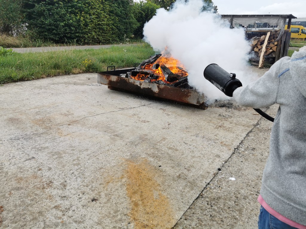 Mit dem Pulverlöscher, CO2-Feuerlöscher und Schaumlöscher Brände löschen.