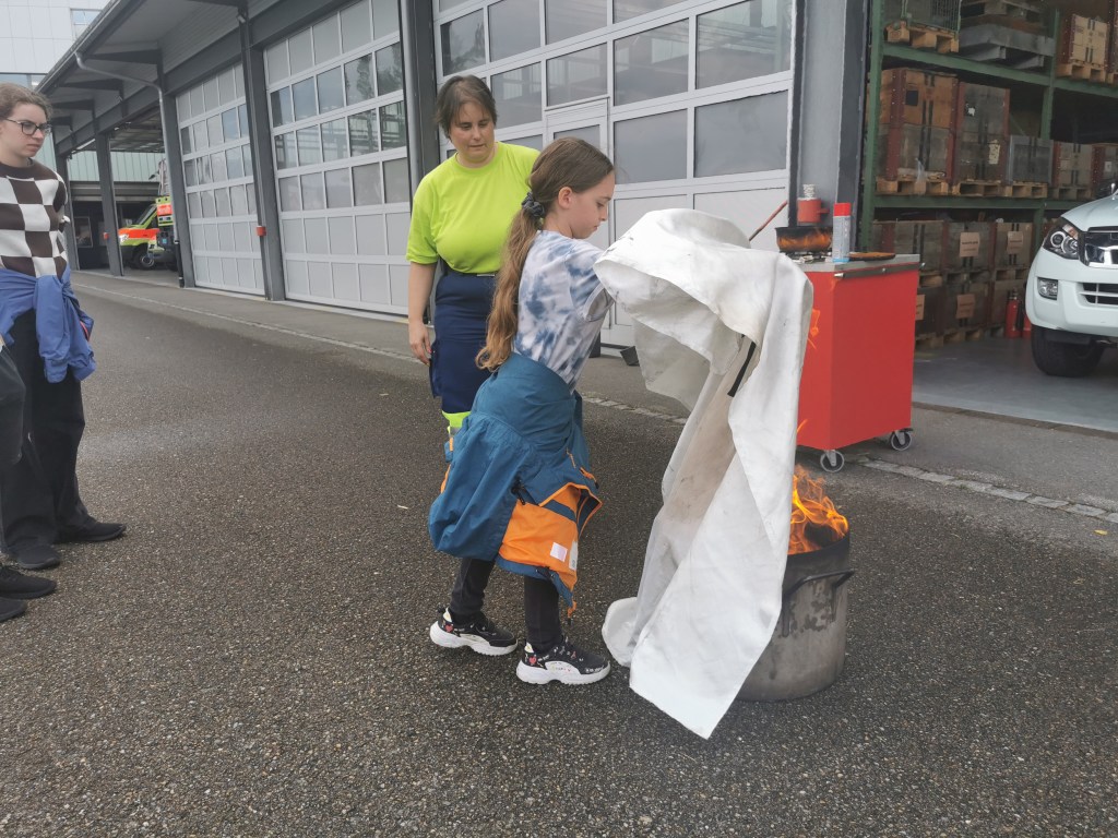 Wir durften einen Pfannenbrand mit der Löschdecke löschen.