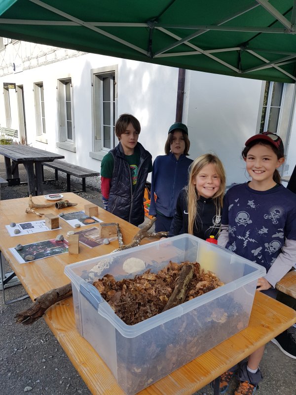 Es gab auch einen spannenden Vortrag zum Rothirsch im Sihlwald und Umgebung. Nach dem Vortrag kam Martina Reifler-Bächtiger (Projektteam, Rothirsch im Schweizer Mittelland) noch zu unserem Stand; unzählige Fragen der Junior Ranger:innen beantwortet werden.