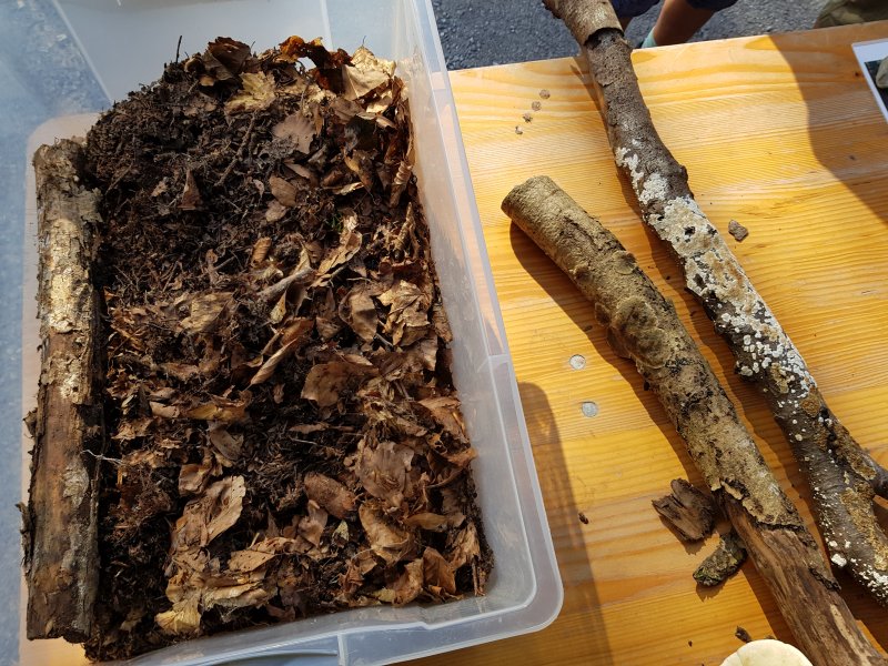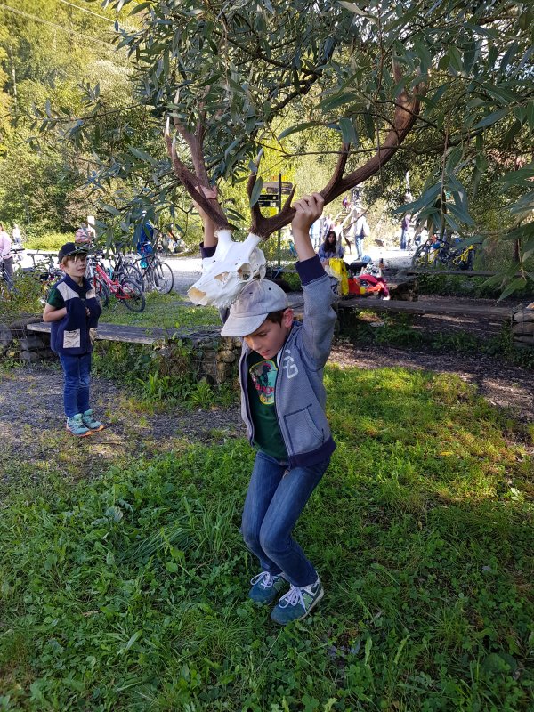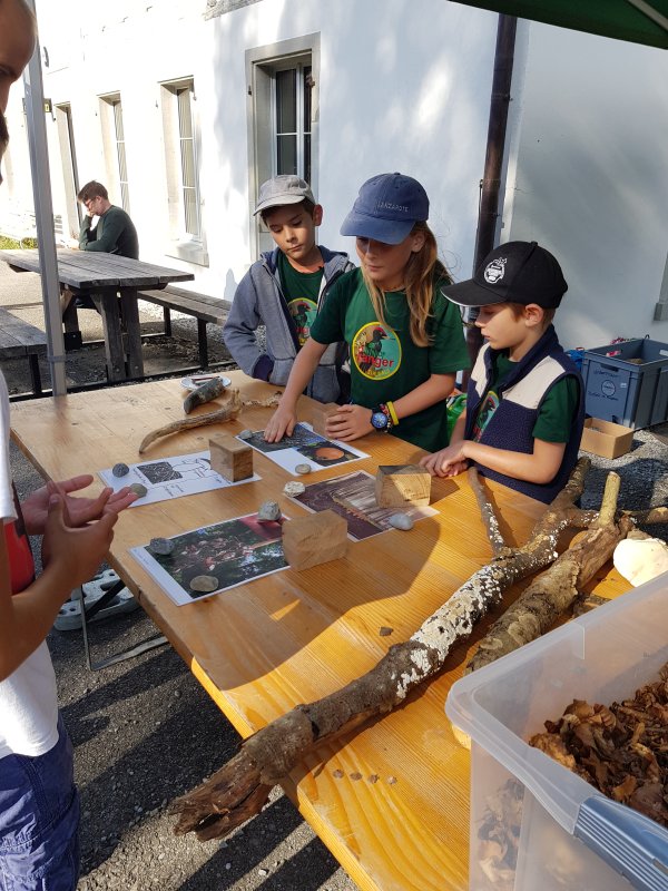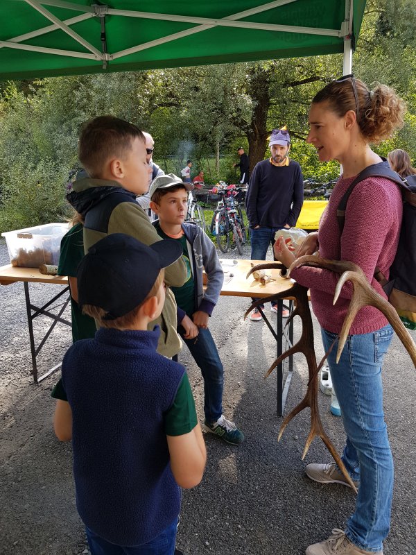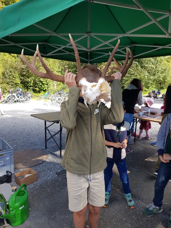 Diesmal haben die Junior Ranger:innen an einem Stand den Besuchenden die Rolle der Pilze näher gebracht und den Unterschied von Geweih und Horn erklärt. Leider war der Wind zu stark, um für einen Materialtest Horn und Geweih anzuzünden.