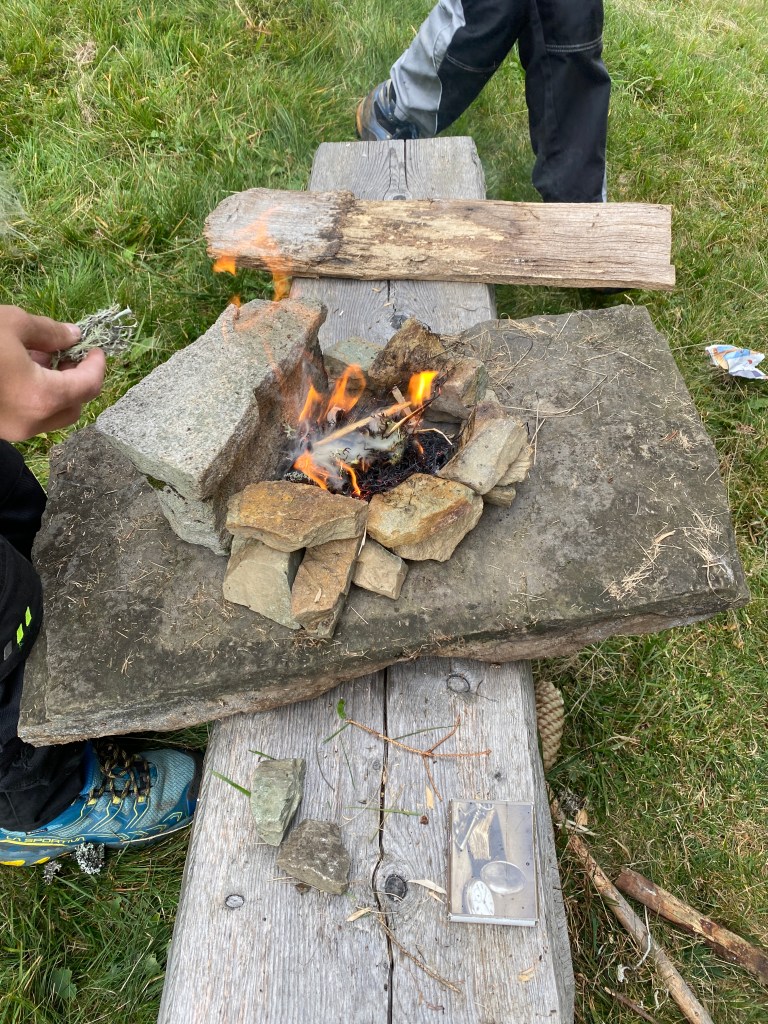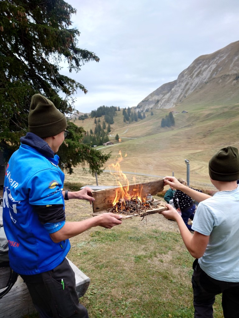 Für was ist eigentlich das Feuer gut? Was hat es dem Menschen gebracht? Und wie transportiere ich ein mit drei Streichhölzern und einem Stück Zeitung angezündetes Feuer nur mit in der Natur gefundenen Hilfsmitteln zur Feuerstelle wo ich das grosse Feuer entzünde? Damit haben wir uns heute beschäftigt. Und ja, wir haben unsere neuen Wintermützen „Junior Ranger Lombachalp“ erhalten. Unser Lohn von der Aktion Infostand im September.