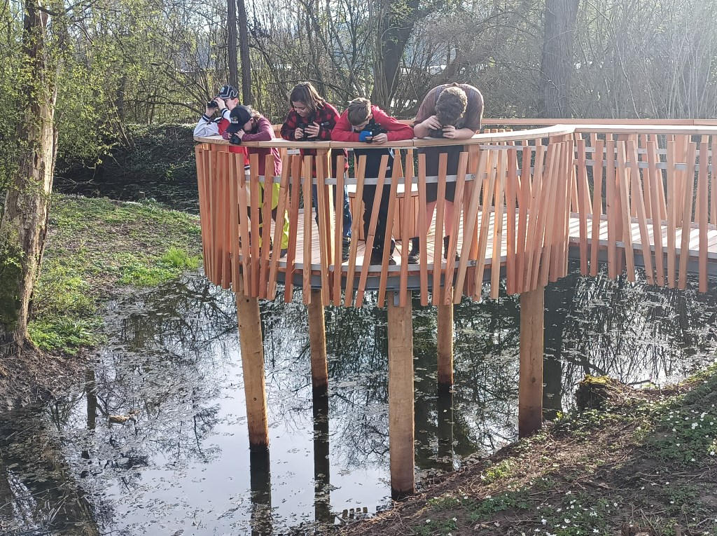 Nachdem wir gelernt haben, wie sich der Frosch vom Laich hin zum „fertigen Frosch“ entwickelt haben wir uns die Feldstecher der Silberweide geschnappt und sind an die neue Besucherplattform der Knopflischlinge gelaufen.