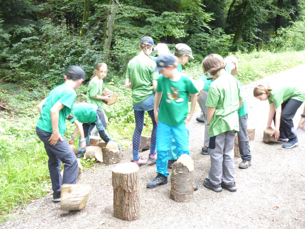 Anschliessend ging es ab in den Wald zu einem Baumstammpuzzle. Dort durften die Kinder die zersägten Baumstammteile zusammenstellen und die Bäume benennen. Keine einfache Disziplin!