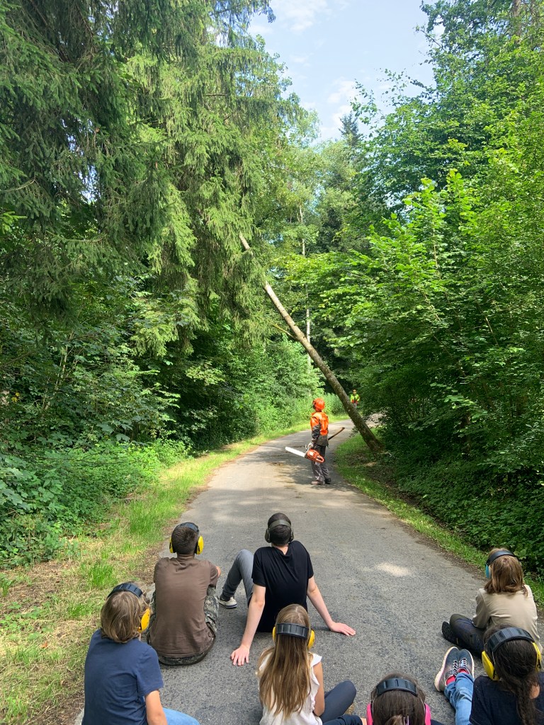 Und wir durften selber auch was schaffen! Toll! 🙂 Und dann durften wir noch dabei sein, als eine kranke Esche gefällt wurde, die zur Gefahr für die Strasse wurde.
