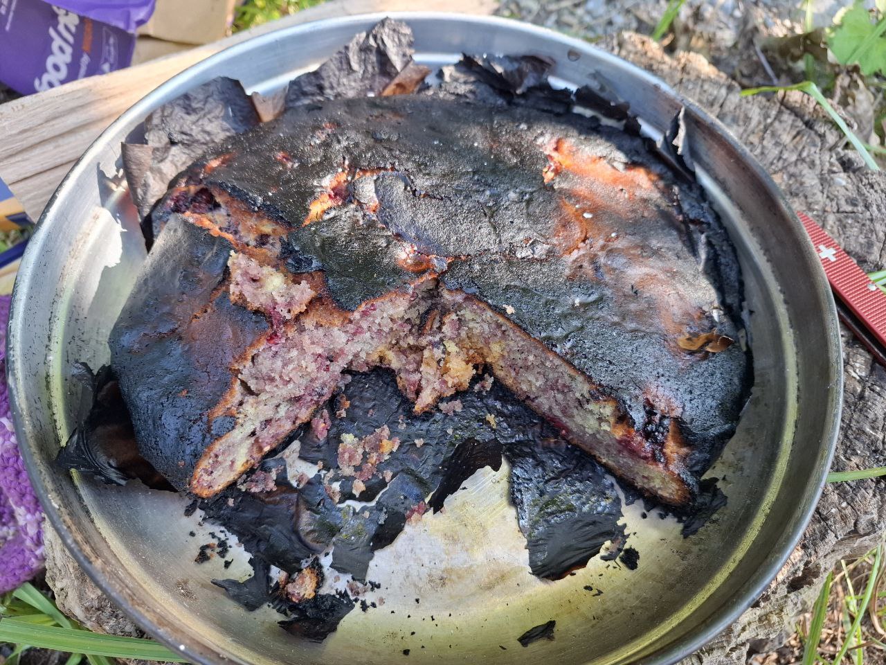 Aus Brombeeren, Himbeeren, Schlehe/ Schwarzdornbeeren, Weissdornbeeren und Holunder, bereits vorher gesammelt, mischten wir einen köstlichen Kuchen. Leider war das mit dem Feuer etwas unberechenbar und er bekam doch etwas Schwärze ab. Aber innendrin war er doch noch sehr lecker!