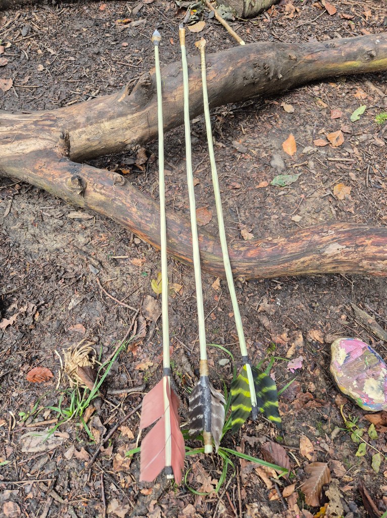 Das Endergebnis war durchaus sehenswert. Die Steinspitzen wurden mit Hilfe von Bindfäden und neuzeitlicher Schuhcreme (kleiner Ersatz für das Birkenpech) an den Pfeilen befestigt. Danach kam die Befiederung dazu. Fertig waren unsere Jagdwerkzeuge!