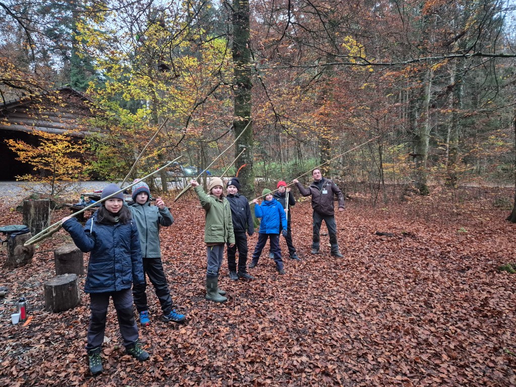 Und am Ende hatten wir durchaus vorzeigbare Speerschleudern, die nicht nur schön, sondern auch funktional waren. Als alle parat waren, ging es drum die Jagdtechnik genauer anzuschauen. Mangels Urzeittiere wurde ein „Mammutbuchenbaum“ als Ziel ausgewählt und gedanklich mehrmals erlegt.