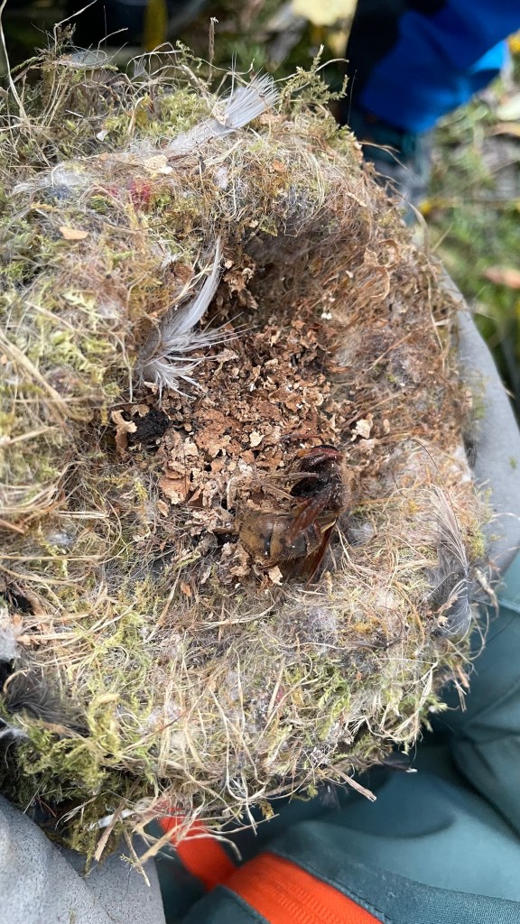Einige Vogelnistkästchen konnten wir auch mit grössten Anstrengungen nicht öffnen, einige waren defekt und ein paar auch einfach leer. In drei Nistkästen fanden wir trotzdem noch Nester und im letzten Nest aus Beton, an einer alten Föhre mit ganz viel Efeu, überraschte uns ein kleines Waldmäuschen. Schnell machten wir die Klappe wieder zu, um das herzige Tier nicht zu stören. In einem Nest entdeckten wir auch ein kleines Hornissennest mitsamt einer toten Hornisse!