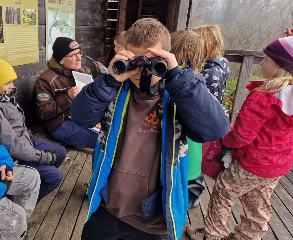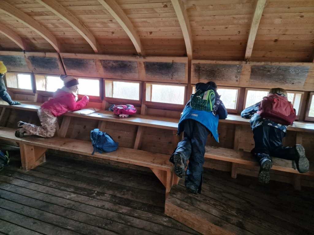 Nach einem kurzen Marsch erreichten wir schliesslich den Hide, der auf einem Bunker aus dem 2. Weltkrieg direkt am Ufer des Rheins gebaut worden war. Die Buben interessierte der alte Bunker fast mehr als die Vögel; zum Glück ist der Bunker abgeschlossen und der Zutritt verboten. Auf dem Hide erhielten wir von Rangerin Barbara einen Input zum Thema „Pfeilstorch“. Pfeilstorch ist die Bezeichnung für einen Storch, der beim jährlichen Flug zwischen Afrika und Europa urch einen Jagdpfeil verletzt wurde und mit dem Pfeil im Körper den Flug nach Europa überstand. Erst dadurch wussten die Wissenschaftler, dass einige Vögel im Winter in den Süden ziehen. Wir versuchten, möglichst viele Vögel aufzuzählen, die hierbleiben oder aber im Winter wegziehen. Wir erfuhren auch, dass die Küstenseeschwalbe der Vogel ist, der den weitesten Weg zurücklegt: Bis zu 96’000 km pro Jahr legt sie zurück, von arktischen Gefilden bis in die Antarktis und retour!