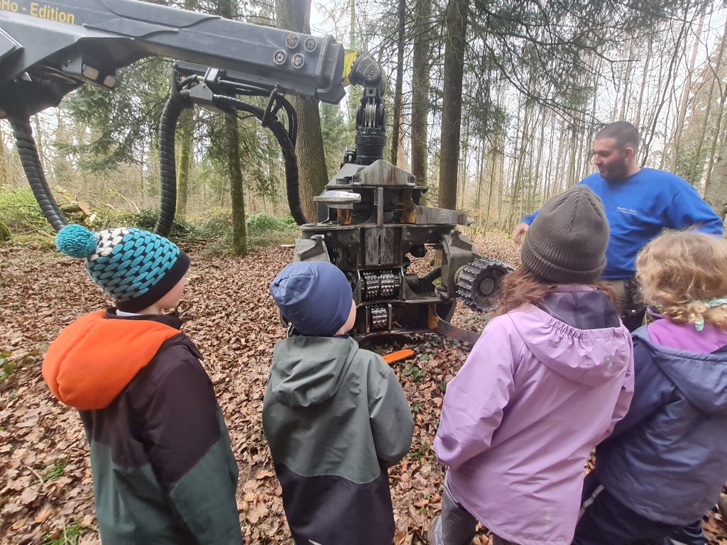 Danach ging es weiter durch den Wald. Wir haben uns mit der Waldverjüngung und der Holznutzung beschäftigt. Zum Abschluss hatten wir ein riesiges Glück. Der Vollernter war gerade in Betrieb und wir konnten die 12 Tonnen schwere Maschine anschauen.