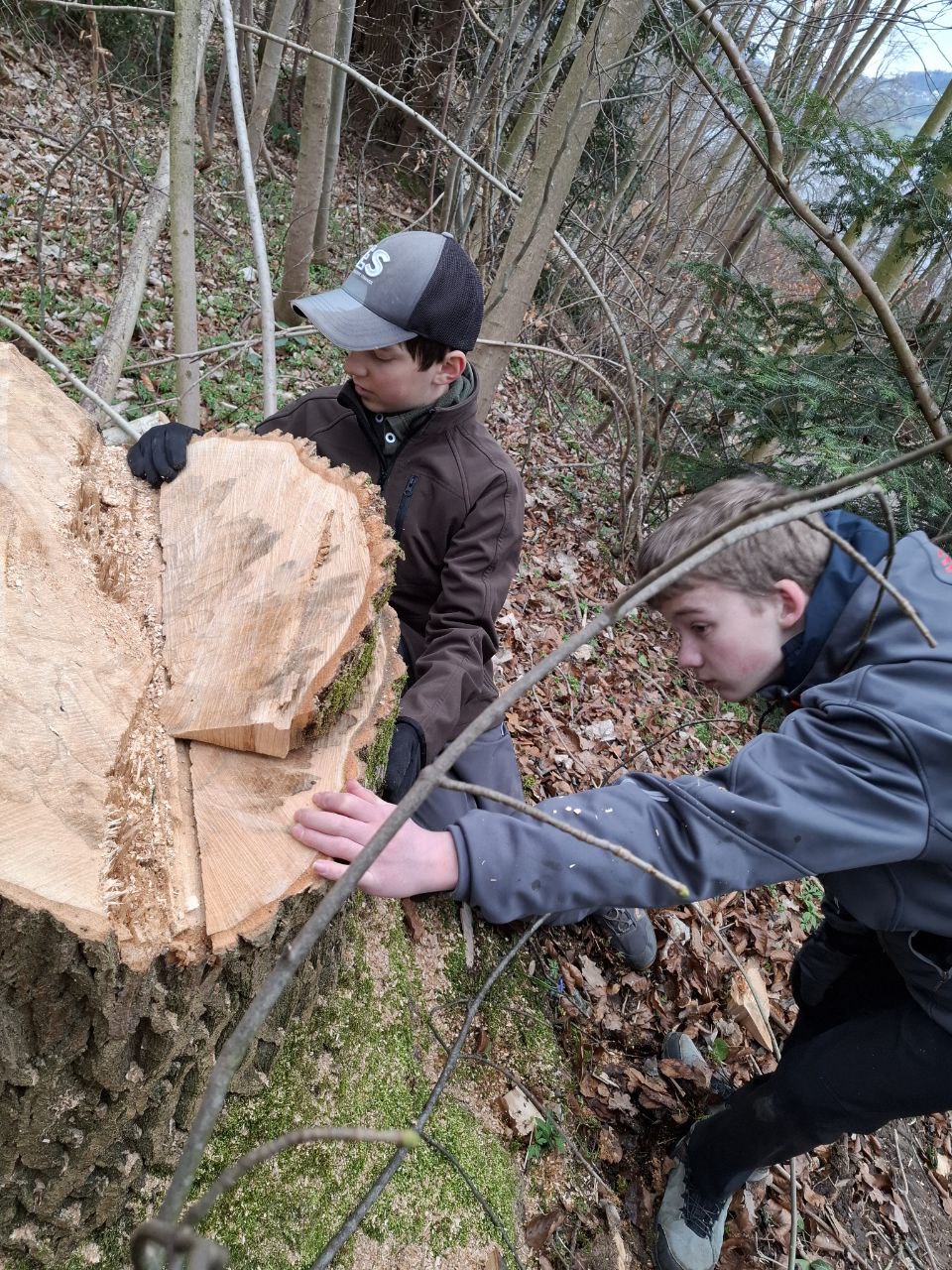 Anschliessend widmeten wir uns den vielen gefällten Bäumen. Wir probierten sie zu bestimmen und waren erstaunt dass eine Eiche etwa stattliche 170Jahre alt wurde. Wir entdeckten Rehbetten mit Haaren vom Fellwechsel, Spuren von Federn lassen vermuten dass eine Krähe von einem Habicht erwischt wurde.