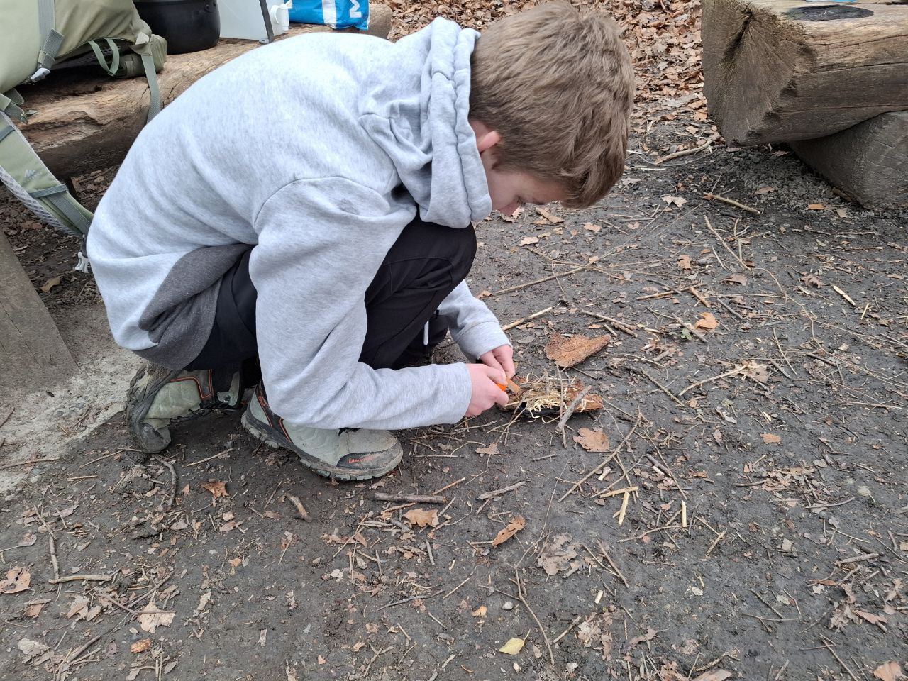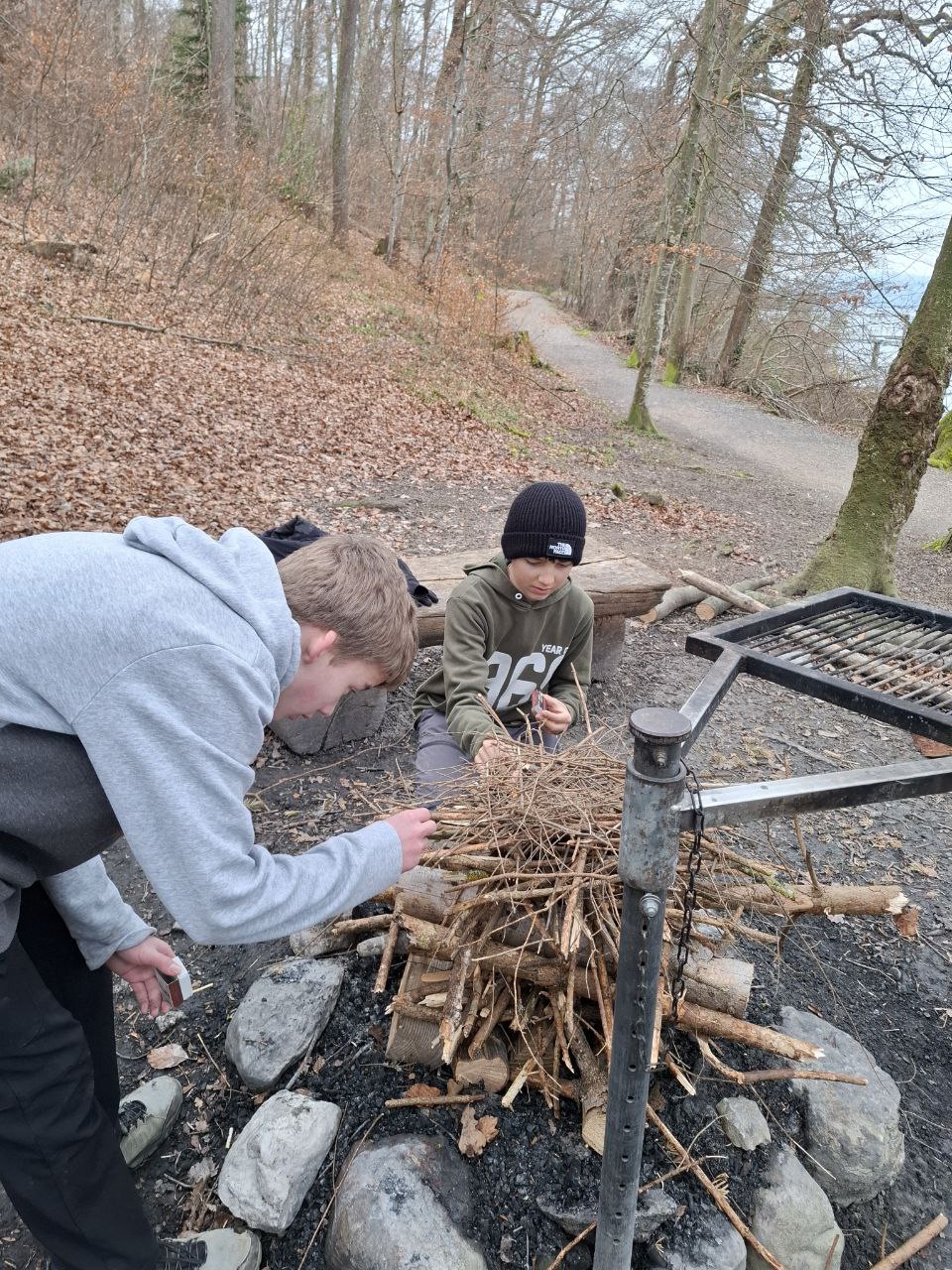 Bei der Feuerstelle angekommen suchten wir nach Holz. Es wurde im Wald viel geholzt also war es wichtig nur trockenes Holz zu sammeln. Nachdem das Schichtenfeuer angezündet war, konnten die Young Ranger selber kleine mimi Fürli machen.