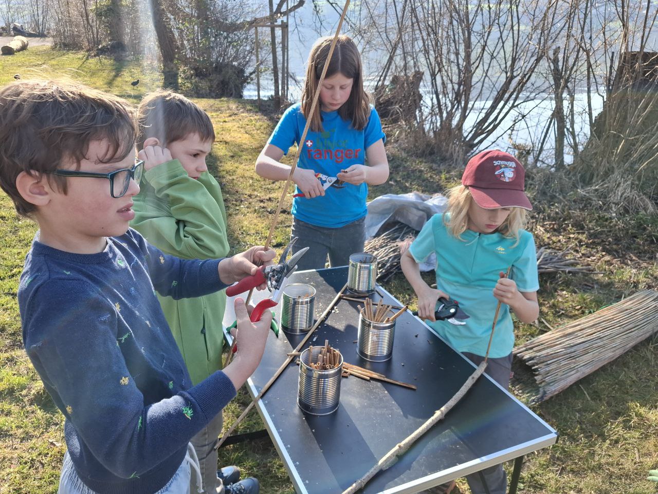 Um wieder in Bewegung zu kommen machten wir ein schnelle lustige Stafette. Es ging darum dass die Wildbienen möglichst viel Nektar sammeln mussten und diese ohne Verlust. Nach der Pause wurden die Junior Ranger aktiv und durften Nisthilfen für die Wildbienen herstellen. Dies hat allen sehr Spass gemacht. Danke Markus fürs organisieren.