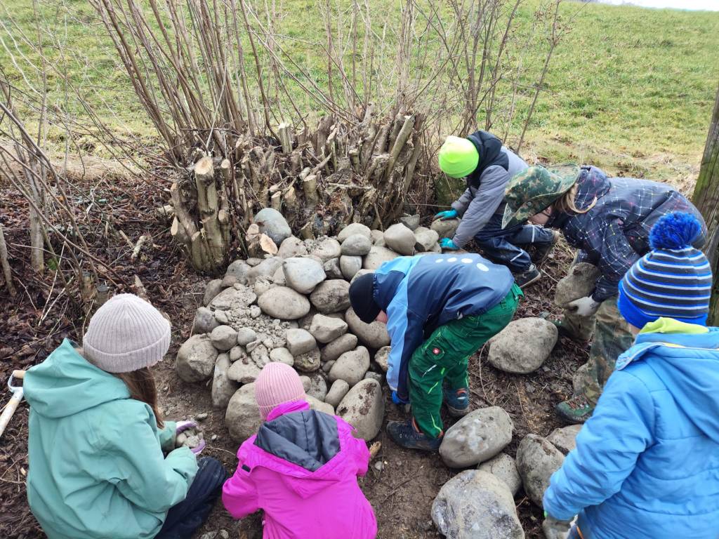 Wie bereits gelernt…. wird eine Kammer für das Wiesel gabaut und danach mit Steinen der Steinhaufen für weitere Tiere gebaut.