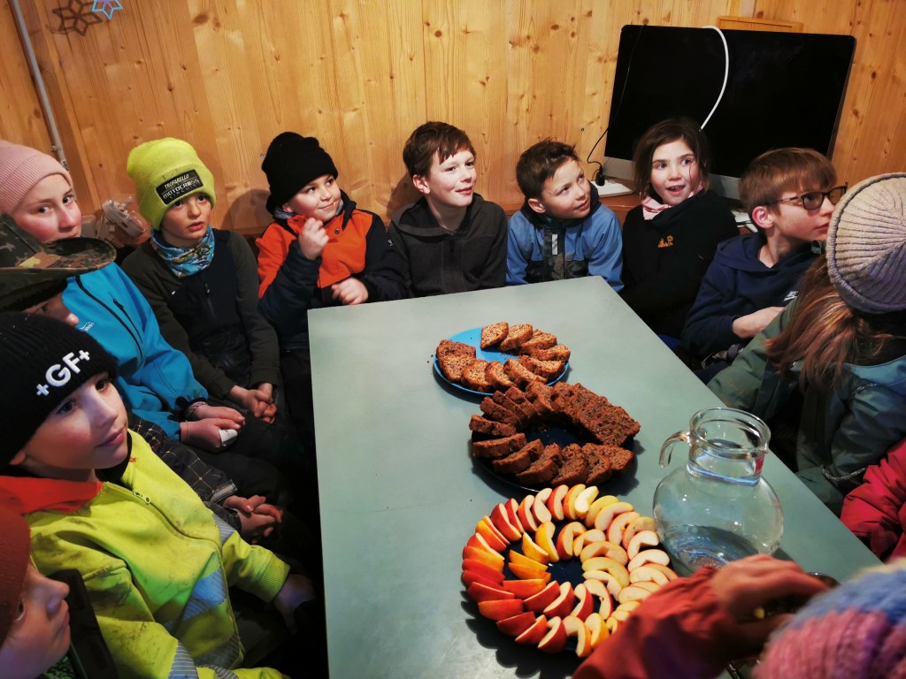 Wer viel arbietet hat auch Hunger. Da die Junior-Ranger nicht nur vom Arbeiten verschwizt waren, sondern der Regen ein ständiger Begleiter war, ist das Zvieri in der Bauernstube sehr willkommen.