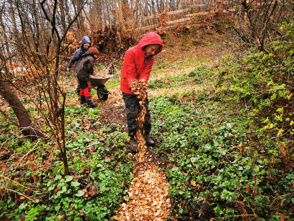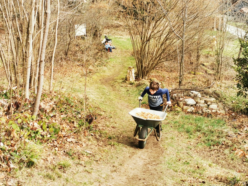 Mit schweren Karetten werden 7 Kubikmeter Holzschnitzel verteilt.