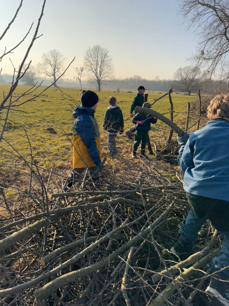 Nach dem alle Pfähle versenkt waren und damit das Grundgerüst gegen war, ging es an das Befüllen. Dabei achteten wir darauf, dass wir die Äste der Länge nach legten und diese auch gut ineinander steckten. Dadurch wird die Totholzhecke Dicht und Stabil und bieten den Bewohnern und Schutzsuchenden optimale Deckung.
