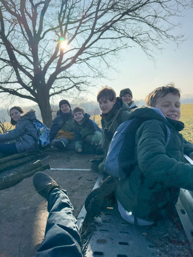Es dauerte eine ganze Weile bis wir den mit Ästen gefüllten Anhänger komplett geleert hatten. Das Benjeshecken Projekt hat eine menge Spass gemacht und wir sind gespannt wie es sich entwickelt. Das Mitfahren auf dem Anhänger zum Standort der Hecke war natürlich auch ein Highlight:)