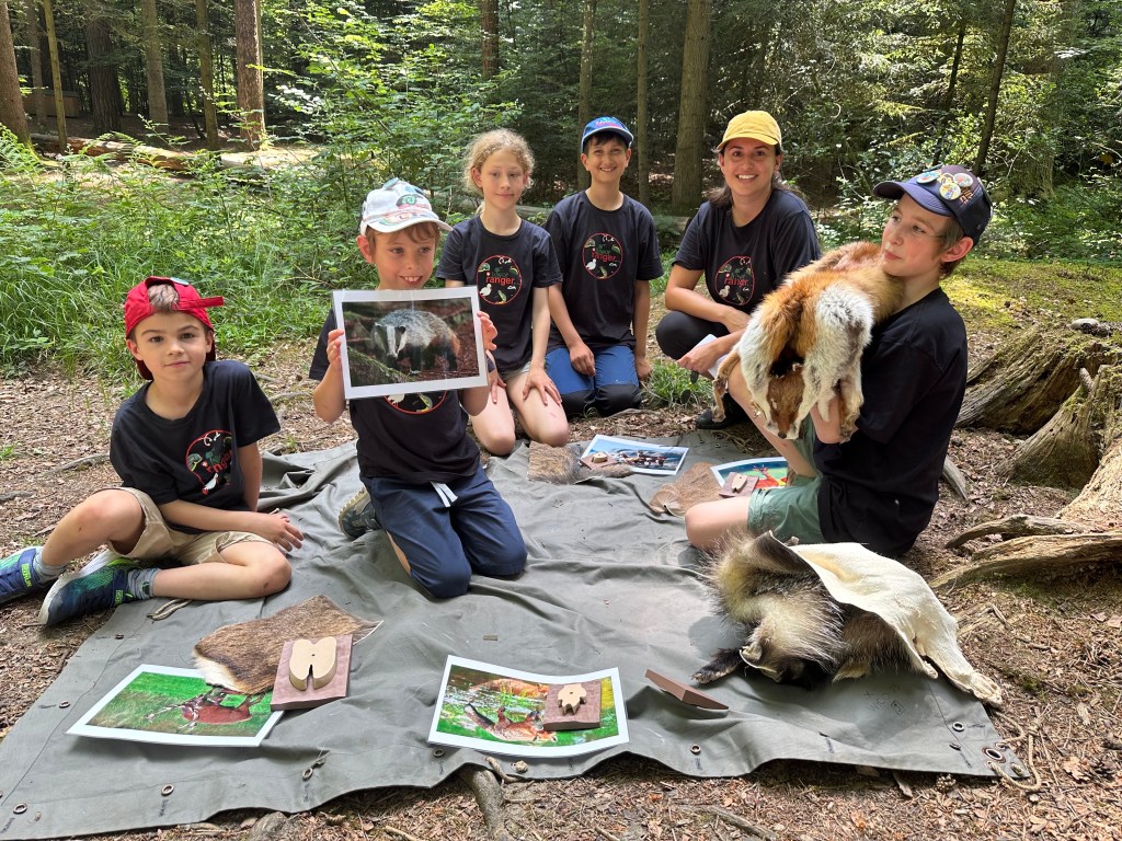Am nächsten Posten konnten wir Felle und Trittsiegel zu den Tieren zuordnen. Auch unser Flaggentier der Dachs war mit dabei. Wir hatten fast alles richtig, nur das Trittsiegel vom Reh und der Gämse haben wir vertauscht. Dafür haben wir aber etwas Neues gelernt!