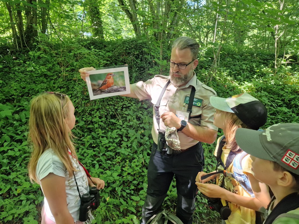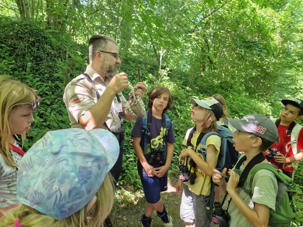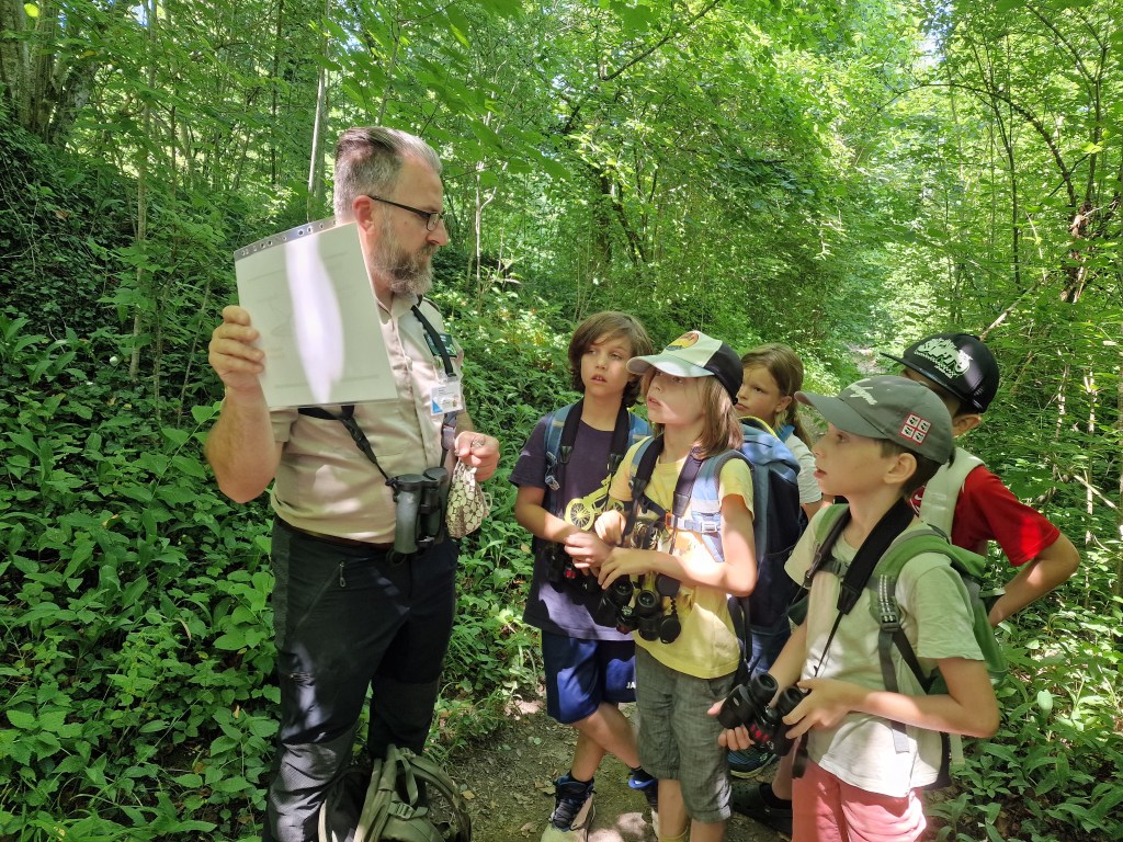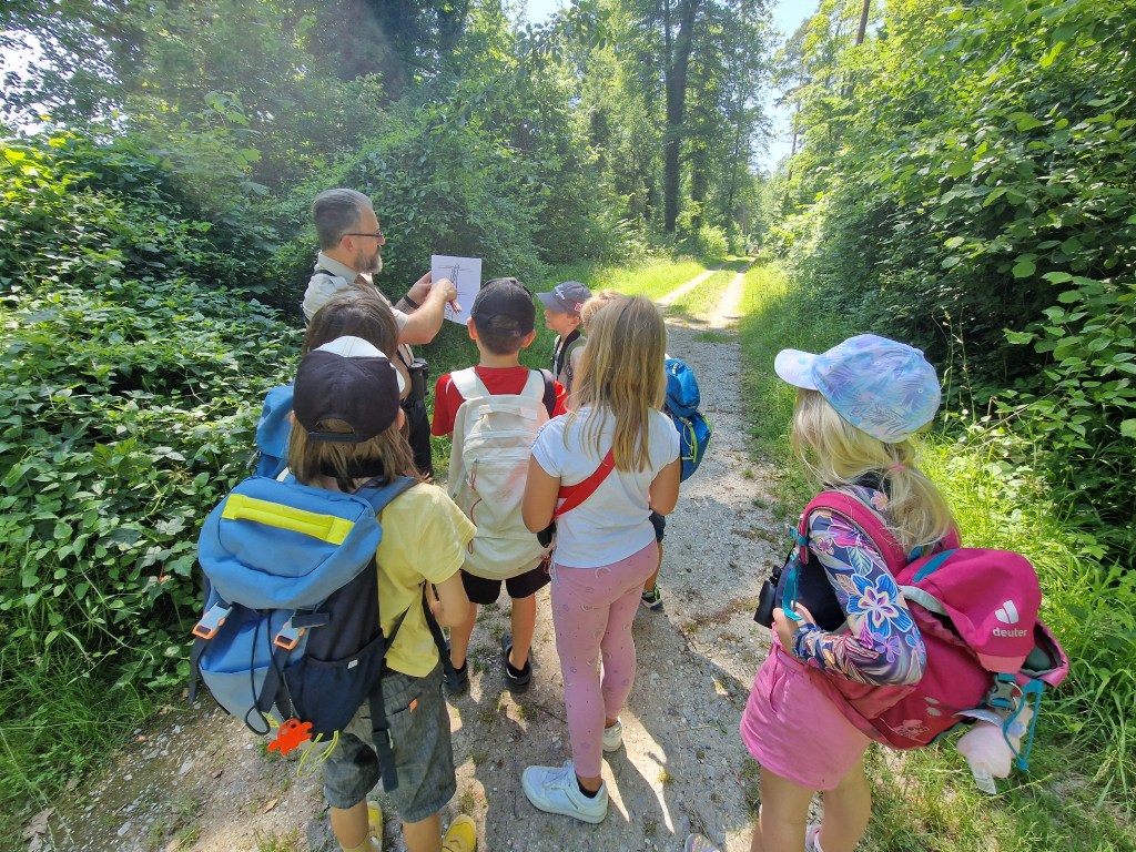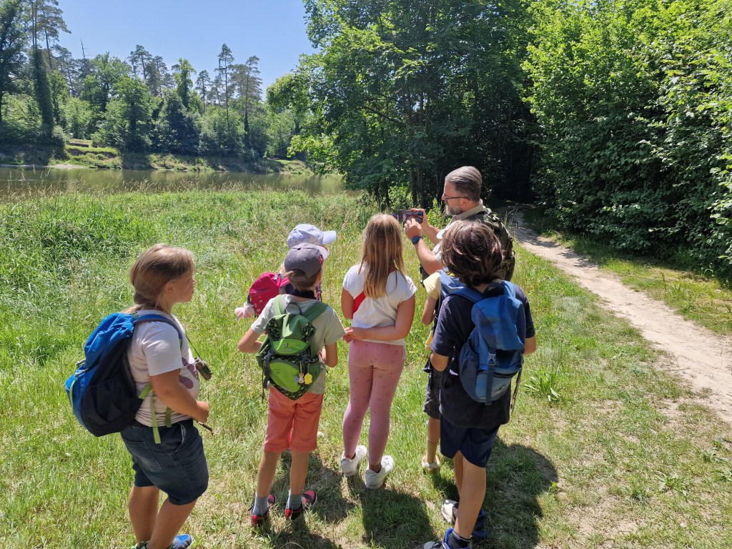 Bei der letzten Gruppe hatten wir ganz besondere Gäste dabei: neugierige Schnupper-Junior-Ranger! Sie wollten herausfinden, ob das Junior rangern etwas für sie ist. Gemeinsam lernten wir, was ein Naturschutzgebiet eigentlich ist, was die Thurauen so besonders macht, was die Tafeln mit „Verboten!“ und „Erlaubt!“ bedeuten und welche Aufgaben Ranger in den Thurauen haben. Wusstet ihr, dass es verschiedene Ranger-Arten gibt? Zum Beispiel solche, die Tiere zählen, andere, die Menschen informieren oder sogar solche die bewaffnet sind oder auch Ranger, die Müll einsammeln, weil leider immer wieder jemand seinen Abfall liegen lässt.