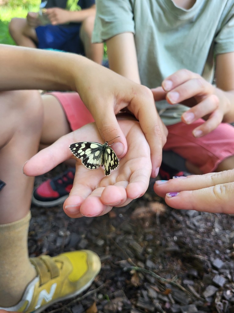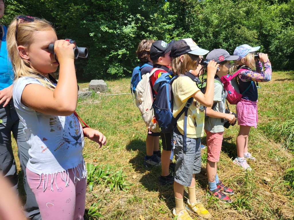 Letzten Mittwoch waren wir Junior Ranger das letzte Mal 24/25 unterwegs – und zwar auf Tiersafari entlang der Thur. Es war weit über 30 Grad heiss!, aber das hat uns nicht aufgehalten. Mit Feldstechern ging’s los! Zuerst hieß es «Augen auf und beobachten» um den schillernden Eisvogel zu entdecken. Der flitzt nämlich blitzschnell am Fluss entlang und ist gar nicht so einfach zu finden, weshalb wir ihn neben vielen Bruthöhlen auch nur einmal gesehen haben.