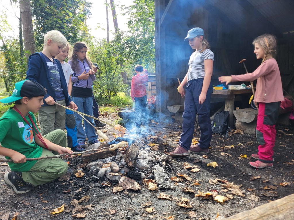 Anschliessend, um uns zu trocknen und zu stärken, gab es ein Lagerfeuer: Leckere Würstli, Schlangenbrot und Marshmallows brutzelten über dem Feuer.