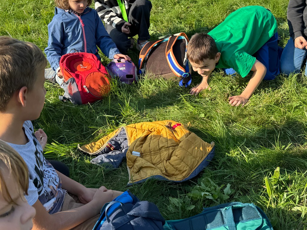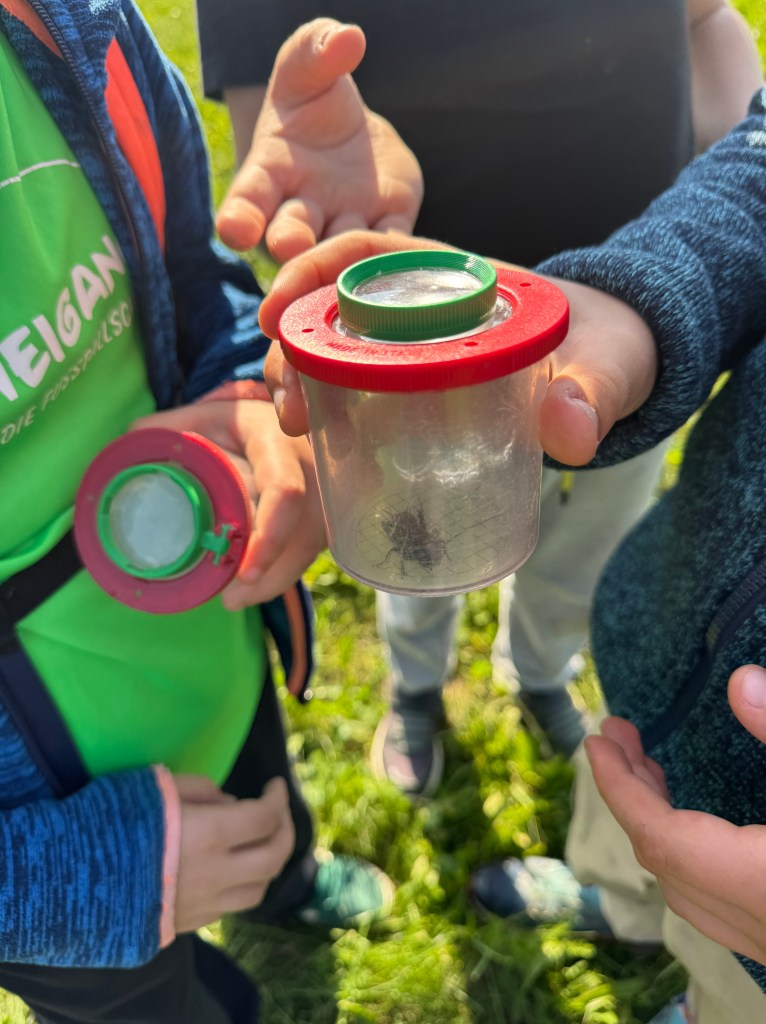 Durch eine Laune der Natur, andere würden sagen Schicksal, entdeckten wir einen Frosch auf einer der Jacken. Amphibien sind ein super Beispiel für wechselwarme Tiere bei uns im LPW. Ausgerüstet mit Becherlupen machten wir uns auf die Suche nach weiteren wechselwarmen Wesen.