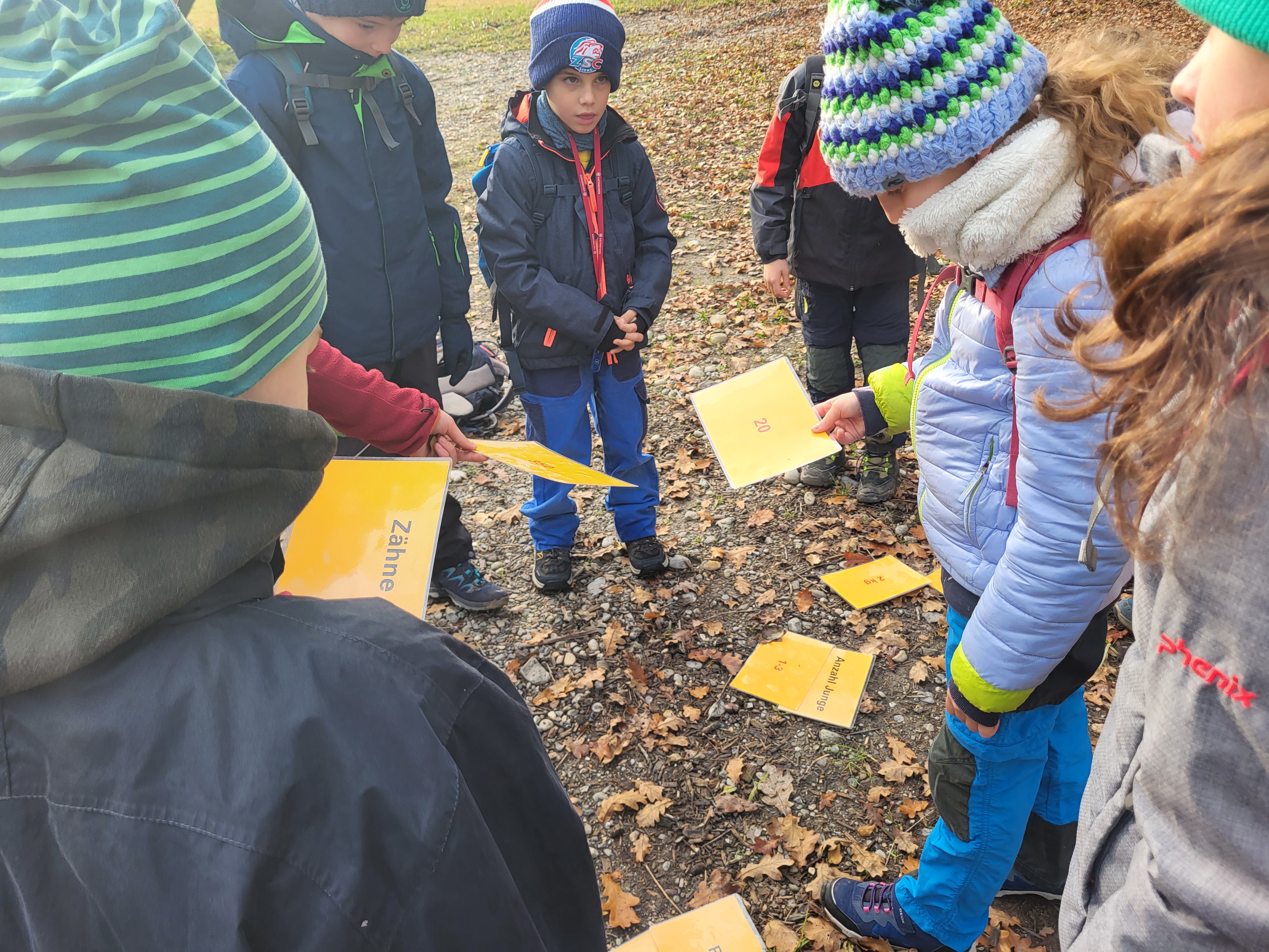 Um ein echtes Gespür für das Tier zu bekommen, folgten zwei Suchspiele im Gelände. Erst mal suchten wir Gegenstände die so hart sind wie seine Zähne oder etwas dass er frisst, andere Tiere aber nicht und umgekehrt etc. Wir suchten anschliessend auch gezielt nach Trittsiegeln, Frassspuren, Biberburgen und Rutschen. In der gemeinsamen Nachbesprechung wurde klar: Der Biber gestaltet seinen Lebensraum sehr aktiv um, was nicht immer ohne Konflikte mit dem umliegenden Wald geschieht.